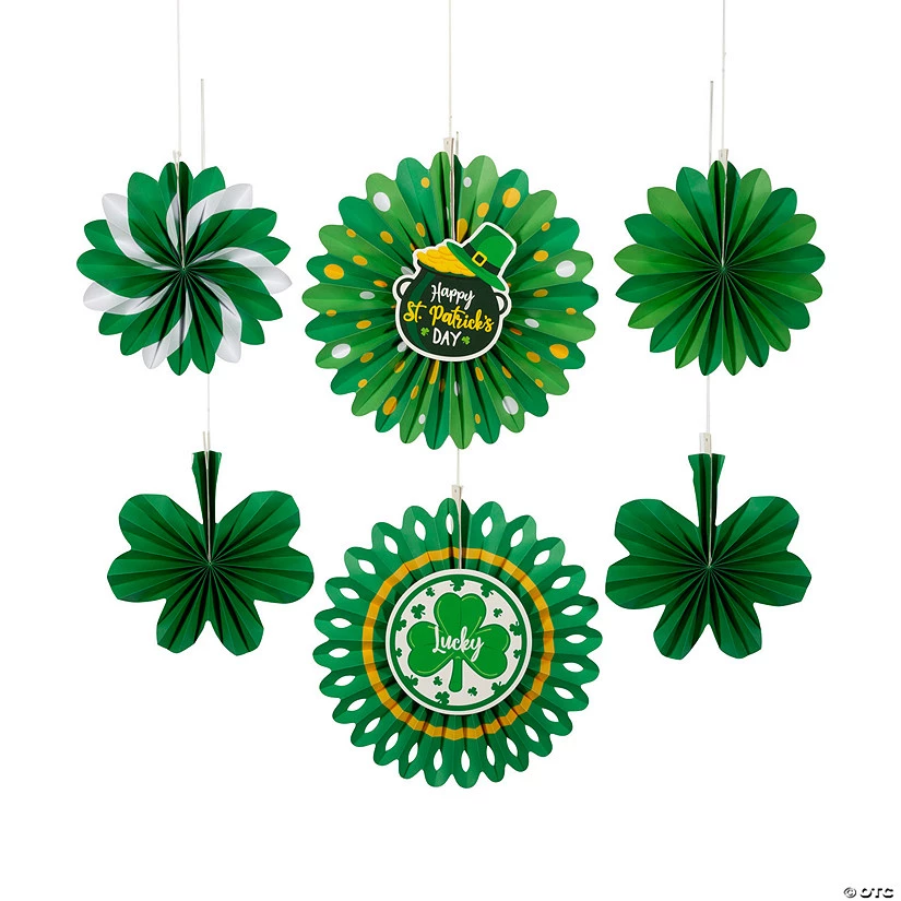 • PERFECT FOR ANY EVENT: From St. Patrick’s Day parties to decorating Irish pubs, hanging fans make the perfect party decorations. They’re versatile and fun!• QUALITY DECORATIONS: Made from quality materials, these green hanging fans only require minimal assembly before they’re ready for display.• VIBRANT COLORS: Choose the hanging fan color that best matches your St. Patty’s Day celebration’s theme for pops of color that will impress guests.• BUDGET-FRIENDLY DECORATIONS: You won’t find these hanging fans at this low price anywhere else! Why spend more on party decorations when you don’t have to?Product Description:Add some variety and depth to your St. Patrick’s Day party decorations with these fun hanging fans! The fans feature plenty of green and comes in a variety of designs – all of which are perfect for St. Patrick’s Day decorations. Hang these in the classroom or at the workplace to get everyone into the mood for some good luck or use them as party decoration. Size: Includes 4 each 10″ and 2 each 14″ diam.Shape: RoundQuantity: 6Material: PaperSimple assembly required.