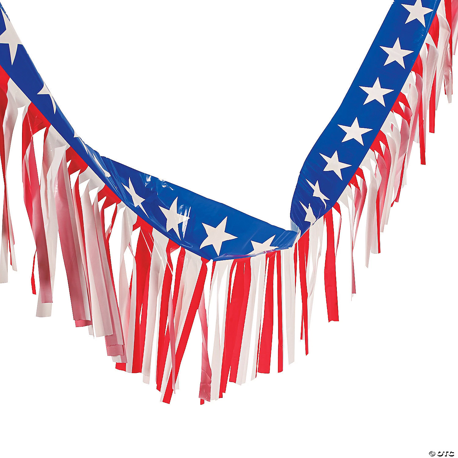 • CREATIVE USES: This décor isn’t only for decorations! Keep on hand for when inspiration strikes for Fourth of July art projects and creative displays.• BUDGET-FRIENDLY DECORATIONS: Add lots of character to the look of Independence Day party decorations without spending lots of money. This garland gives you more bang for your buck.• QUALITY DECORATIONS: You don’t have to pay a fortune for high quality Fourth of July decorations! This fringe is high quality and looks great alongside any other party decorations. • VIBRANT COLORS: This patriotic fringe offers a rich, vibrant color that perfectly coordinates with your patriotic party theme. Product Description:Get party planning and be prepared for a spectacular 4th of July party with this red, white, and blue fringe decoration. It’s perfect for decorating an Independence Day parade float, or use it to cover blank, boring walls, doors, or bulletin board. Size: 100 ft. x 14″ Quantity: 1Material: Plastic© OTC