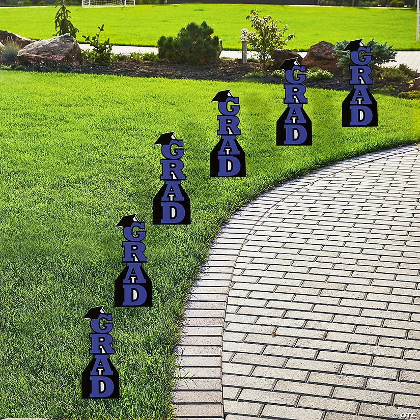 Celebrate your graduate in multiple yards with this set of yard signs. Give yard signs to grandparents and other relatives to display in their yard and keep a couple signs to display in your front yard and back yard. For the graduation party, you can also line up all 6 signs in your yard for a really big and bold statement to make your graduate feel extra special! Single-sided. Corrugated plastic. (6 pcs. per unit) 11″ x 30″ with 22″ metal stakes. Simple assembly required.