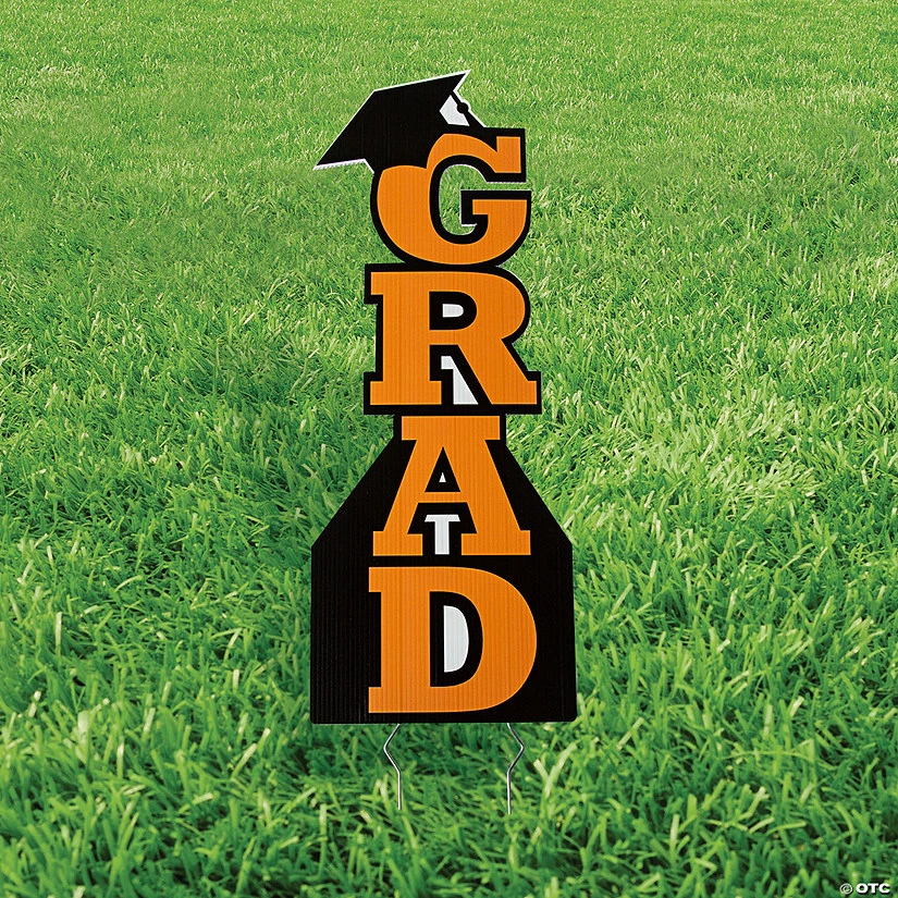 Dress up your lawn for a graduation party or just show off pride in your graduate with this yard stake. This yard sign’s simple but charming design – with the word, ”Grad,” and the addition of a mortarboard hat on top of the, ”G.” – makes a bold statement in your outdoor decorations. Single-sided. Includes metal stakes. Corrugated plastic. 11″ x 30″ Simple assembly required.