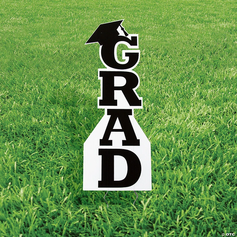 Dress up your lawn for a graduation party or just show off pride in your graduate with this yard stake. This yard sign’s simple but charming design – with the word, ”Grad,” and the addition of a mortarboard hat on top of the, ”G.” – makes a bold statement in your outdoor decorations. Single-sided. Includes metal stakes. Corrugated plastic. 11″ x 30″ Simple assembly required.