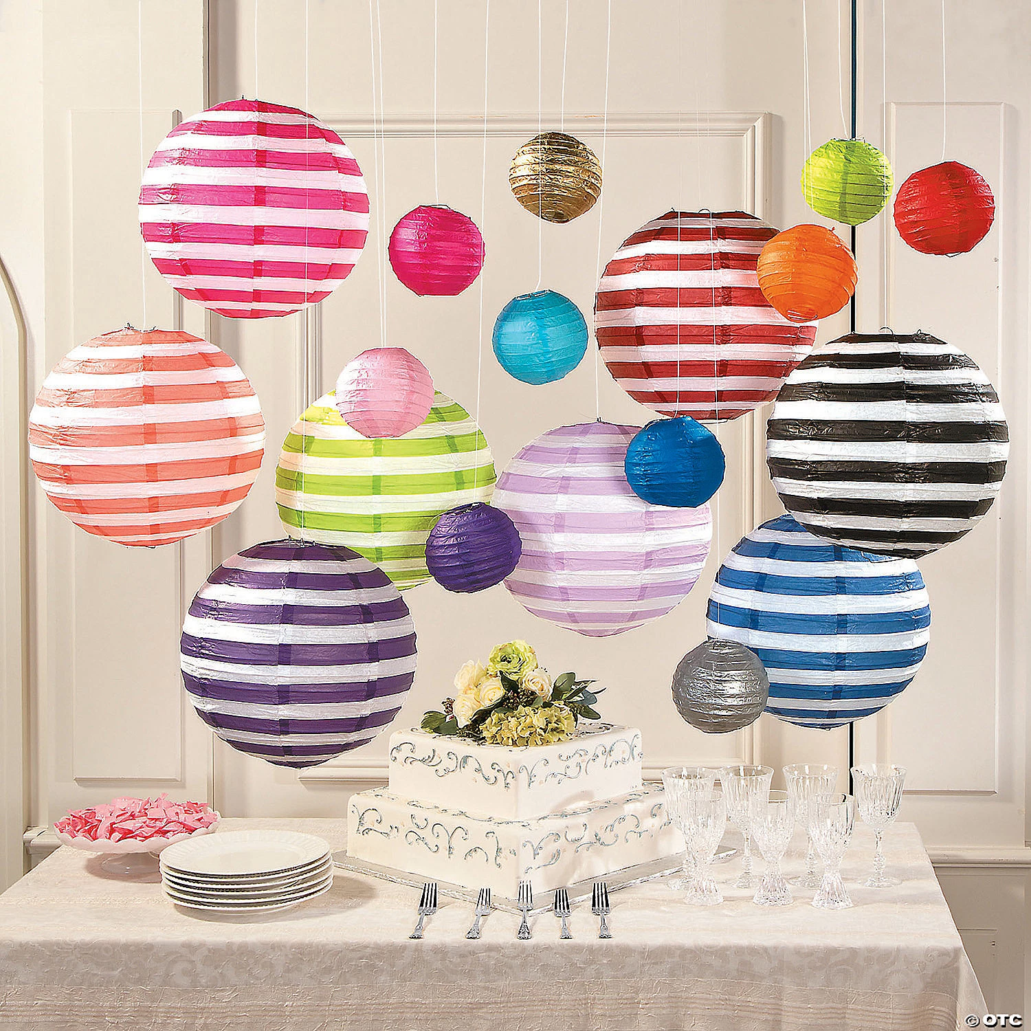 VIBRANT COLORS: With crisp, contrasting stripes, these paper lanterns really stick out and catch the eye!CREATIVE USES: Add paper lanterns to DIY home dĂ©cor projects or use them in science projects or stage props.BUDGET-FRIENDLY DECORATIONS: You won’t find these paper lanterns anywhere else at a lower price – guaranteed!QUALITY DECORATIONS: Made from durable paper, these lanterns will impress guests and will not easily collapse or tear. PERFECT FOR ANY EVENT: These versatile paper lanterns can be used for a variety of events! From graduation parties to birthday parties, these lanterns can add depth to party decorations.YOUR PARTY SUPPLY HEADQUARTERS: Shop Oriental Trading for unbeatable selection and guaranteed lowest prices. From decorations to tableware to party favors and more, we can help you party for less!Product Description:It’s a black-tie affair with these classy Black Striped Paper Lanterns. Versatile enough to match all of your party decorations, these dynamic designed lanterns are perfect for turning any hum drum event into a celebration spectacular! Great for anniversaries, bridal showers and more. Hang these lovelies from the ceiling with other party accessories to achieve the full effect. Paper. (6 pcs. per set) 12″Size: 12”Shape: RoundQuantity: 6 pcs. Material: Paper.
