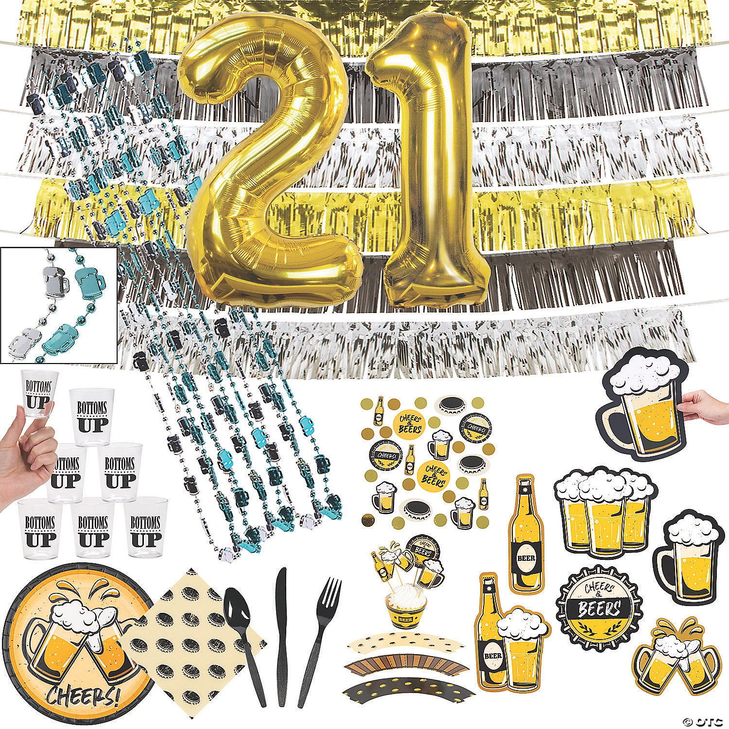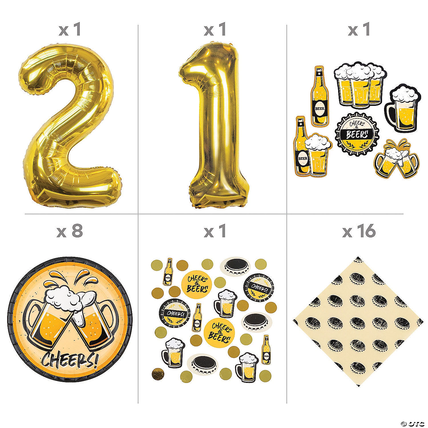 Celebrate a 21st birthday in style with this helpful tableware kit that’s chock full of 21st birthday disposable tableware, decorations and fun party favors that will help make a 21st birthday extra special. With enough plates, napkins and cutlery for up to 8 guests, this impressive kit also has plenty of decorations and bar accessories for a 21st birthday bash. (423 pcs. per unit) Assortment may vary.Includes:• 1 Gold 2 Shaped Number Mylar Balloon (34″)• 1 Gold 1 Shaped Number Mylar Balloon (34″)• 24 Plastic Beer Mug Beaded Necklaces (32″ circ.)• 2 oz. Paper Beer Confetti (1/4″ – 1″)• 100-Pc. Paper Beer Cupcake Wrappers with Picks Set (Includes 50 wrappers and 50 picks. Wrappers, 8″ x 2″; picks, 2″ shapes on 4″ wooden sticks.)• 6 Cardstock Beer Wall Cutouts (4 3/4″ – 13 3/4″ x 10 1/2″ – 16 3/4″)• 210-Pc. Plastic Cutlery Set (Includes 70 of each: forks, knives and spoons. Approx. 6″ each.)• 50 Plastic Bottoms Up Shot Glasses (2 1/4″ 2 oz.)• 16 Paper Cheers & Beers Beverage Napkins (5″)• 8 Paper Cheers & Beers Dinner Plates (9″)• 6-Pc. Foil Black, Gold & Silver Fringe Garland Backdrop (61″ x 10″)