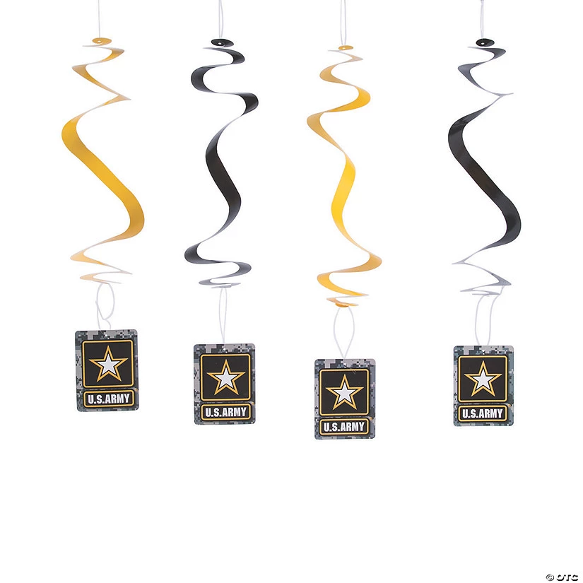• QUALITY DECORATIONS: These officially licensed ARMY® decorations are a great way to celebrate your service member! Sturdy and versatile, our party décor selection can be mixed and matched for a complete look!• PERFECT FOR ANY U.S. ARMY® EVENT: Whether you’re celebrating a military retirement or you’re throwing a welcome home party for your solider, or any Army® event in-between, these hanging decorations are a great addition to party decorations!• BUDGET-FRIENDLY DIY DÉCOR: Not just for service parties, these dangling swirls make fun, affordable additions to your office or community center.• VIBRANT COLORS & DESIGNS: These swirl decorations contain rich, vibrant yellow and black swirls with striking cutouts that perfectly match up with your event theme and color scheme. • VERSATILE HANGING DÉCOR: Great for indoor and outdoor use! This décor is easy to hang from walls, the ceiling, a window, mantel, overhangs, doorways, archways and/or the ceiling to add some bold style to your party.• EASILY DECORATE ANY PARTY SPACE: Easy to hang, with each spiral having an attached hook. Simply fold them flat to prevent tears after use for easy storage until your next Army® celebration!Product Description:Celebrate your service member in style! With cutouts showing the logo of the U.S. Army®, these black and yellow dangling swirls are a must-have for party décor. They are a simple way to spruce up your space—whether hung above the buffet or as part of a DIY photo booth backdrop! Great for welcome home parties and celebrations or send-off parties.Size: Hangs approx. 28”Quantity: 12Material: Cardstock.• By federal law, licensing fees paid to the U.S. Army for the use of its trademarks provide support for the Army Trademark Licensing Program, and net licensing revenue is devoted to U.S. Army Morale, Welfare and Recreation programs. U.S. Army name, trademarks and logos are protected under federal law and used under license by Oriental Trading.