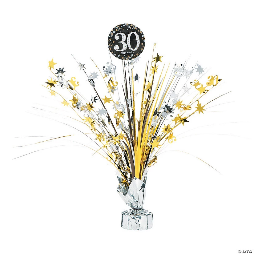 Planning a 30th birthday party? Add this Sparkling Celebration 30th Birthday Centerpiece to your party decorations for a bright look! Find more 30th birthday supplies throughout our site. This centerpiece features silver and gold “30” cutouts and stars with a weighted base. Foil. 18”