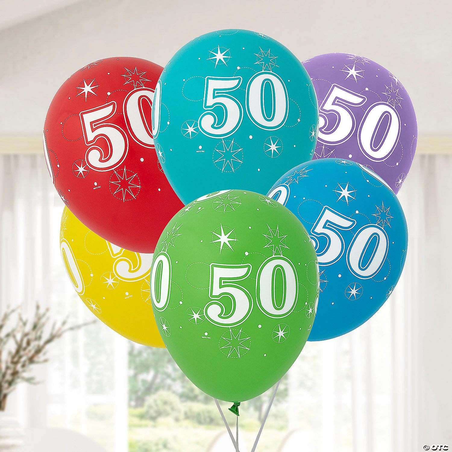 ⢠ADD BALLOON ACCESSORIES: Add visual interest to your milestone birthday party space; creating fun dĆ©cor pieces is easy when you add balloon accessories (sold separately on this site) such as ribbon, balloon weights, balloon cups, balloon strips for garlands and more to transform them into the ultimate party decoration!⢠EASY TO INFLATE: These 50th birthday balloons are easy to inflate with air or helium! We recommend using helium if you plan to add them to balloon accessories (such as a weight with ribbon), so it stays afloat!⢠BUDGET-FRIENDLY DIY DĆCOR These affordable, 11ā helium-grade birthday balloons are a fun way to add a festive style and party spirit to any celebration!⢠PARTY SUPERSTORE: We are your one-stop party shop! Come to Oriental Trading for all of your party supply needs, from party decorations to tableware to party favors and more.Product Description:Add sparkle to your fab at 50 birthday party supplies with this latex balloon assortment! Featuring an array of bright hues, they’re printed with ā50ā and a star motif. These balloons are the perfect party supplies for commemorating your amazing milestone birthday! Place balloons in bundles on guest tables or with other colorful party decorations to create centerpieces.Size: 11″Quantity: 6Material: LatexAssortment may vary. No color choice available.Ā© OTC