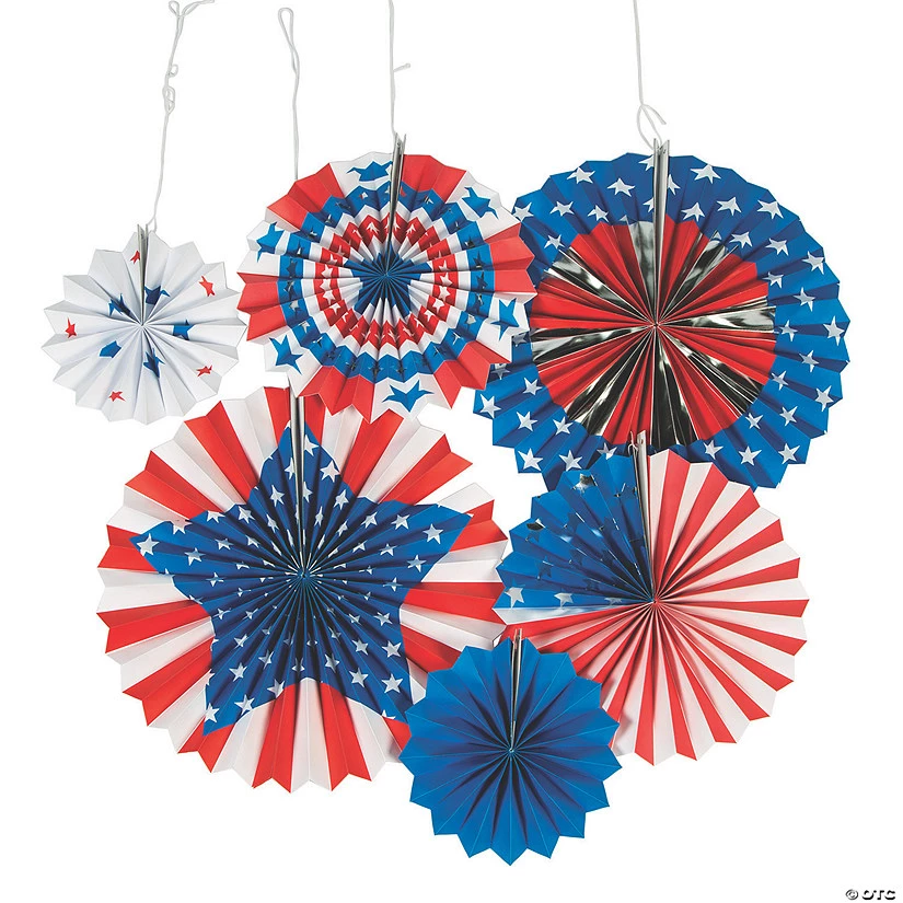 • VIBRANT COLORS: Choose the hanging fan color that best matches your patriotic celebration’s theme for pops of color that will impress guests.• QUALITY DECORATIONS: Made from quality materials, these patriotic paper hanging fans only require minimal assembly before they’re ready for display.• BUDGET-FRIENDLY DECORATIONS: You won’t find these hanging fans at this low price anywhere else! Why spend more on party decorations when you don’t have to?• YOUR PARTY SUPPLY HEADQUARTERS: Shop Oriental Trading for unbeatable selection and guaranteed lowest prices. From decorations to tableware to party favors and more, we can help you party for less!Product Description:Decorating an event using actual American flags is considered by some to violate flag etiquette. When you want a patriotic decorative feel, these hanging fans will do the trick without going against U.S. Code, making them perfect decorations for any celebration for the U.S.A.! Great for parades, military gatherings or patriotic celebrations, these fans will add depth to red, white and blue decorations. Size: Includes 2 each 8”, 12 1/2” and 16” diam.Shape: RoundQuantity: 6Material: PaperSimple assembly required.