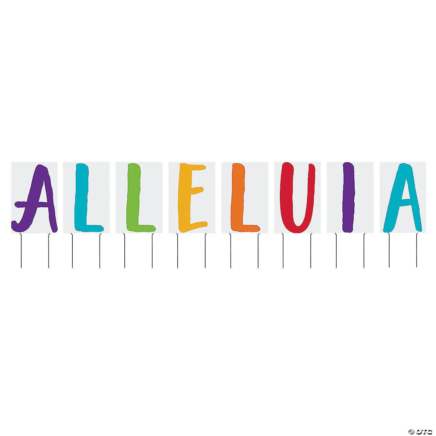Share Easter joy when you display these eye-catching yard stakes! These one-sided yard stakes spell out “Alleluia” and help you send out spring greetings to the community. These outdoor Easter decorations go well with just about any other yard decorations. Corrugated plastic. Includes metal stakes. (8 pcs. per set) 17″ x 26″ Single-sided. Simple assembly required. © OTC