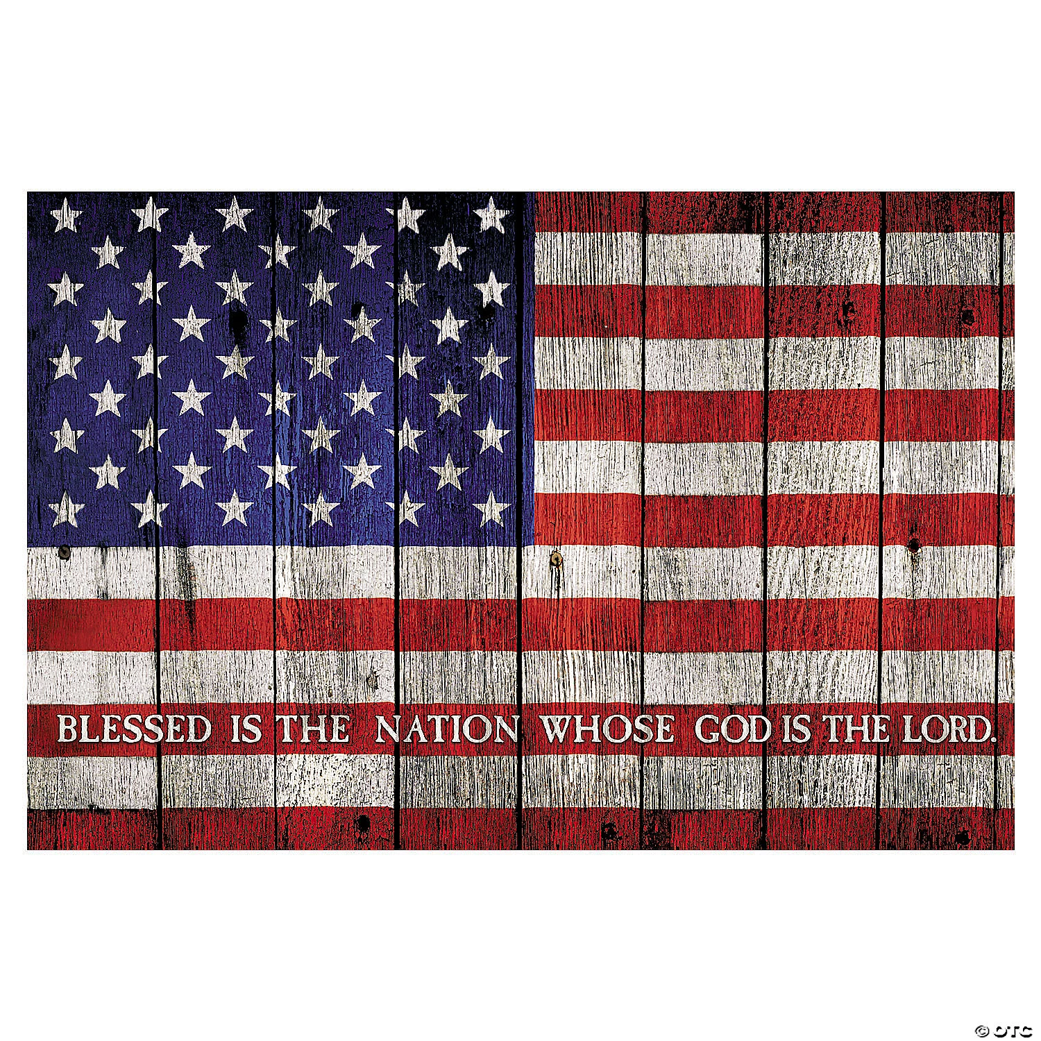 Celebrate your love for the good ole U.S. of A. and your faith! A great addition to patriotic party supplies, this backdrop banner features an image of the American flag and a verse that reads, “Blessed Is the Nation Whose God Is the Lord”. Use it as a quick and easy way to decorate an entire wall or as a photo backdrop at Fourth of July celebrations, Sunday School, VBS celebrations or Memorial Day events. Plastic. (3 pcs. per set) Assembled, 9 ft. x 6 ft. Simple assembly required. © OTC