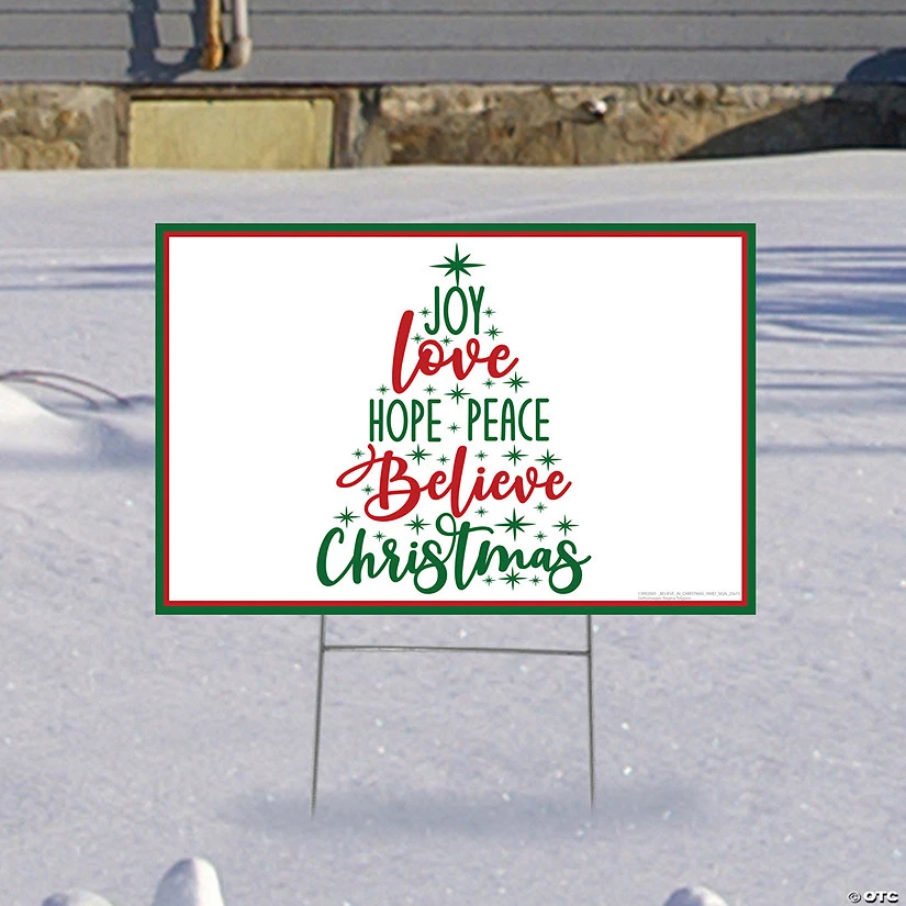 Spread Christmas cheer with this beautiful yard decoration! Featuring such positive messaging as “Joy,” “Love,” “Peace” and more, this sign is great when displayed alone in front of your home, school or business, or add it to your other outdoor Christmas decorations for an added boost of holiday spirit. Corrugated plastic. Includes metal stakes. 23″ x 15″ Simple assembly required.