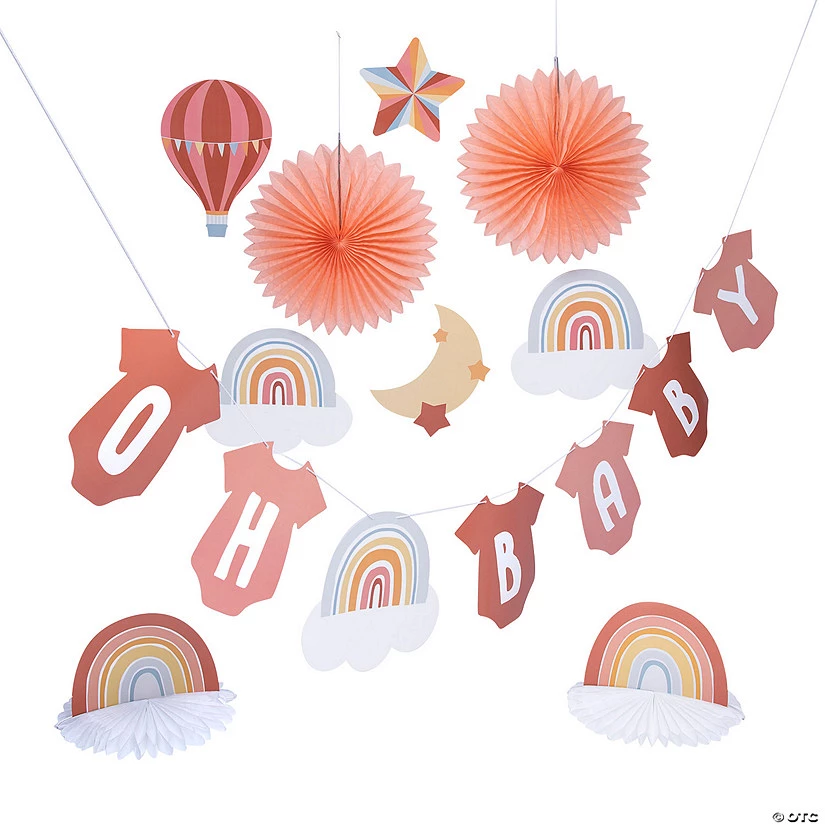 Putting together a lovely baby shower with a boho vibe has never been easier thanks to this helpful decorating kit. This decorating kit has baby shower decorations with a boho rainbow theme including a darling garland, paper fans, wall cutouts and tabletop decorations – everything needed to transform a space into a boho baby shower. Cardstock and tissue paper. (10 pcs. per unit) 7 1/4″ – 78″ x 7″ – 14″ © OTC