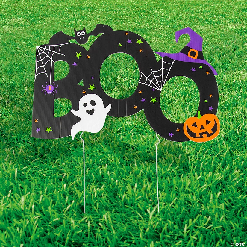 Make your yard look boo-tiful with this outdoor decoration! This cute yard sign features little Halloween characters and spells out the word “Boo”, making it an excellent addition to home décor or Halloween party supplies. It would look great placed on a front lawn or along a driveway paired with other Halloween yard stakes from this website. You can also hold it up as a fun photo prop for a DIY photo booth! Corrugated plastic. 24″ x 16″ Includes two 22″ metal stakes. Single-sided. Simple assembly required. © OTC