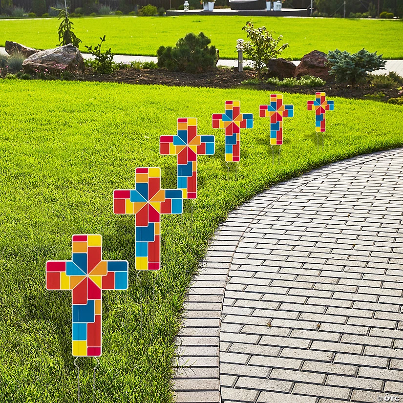 Decorate your sidewalk or the path leading to the entryway with these colorful yard stakes featuring a cross shape. Great for outdoor church decorations or as yard decor for a baptism celebration or Easter gathering, these cross yard stakes help make the path to salvation clear. Celebrate the Resurrection with these attractive yard stakes. Single-sided. Includes metal stakes. Corrugated plastic. (6 pcs. per unit) 8 1/2″ x 12 1/2″ Simple assembly required. © OTC
