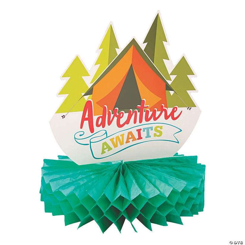 Adventure awaits, indeed! This centerpiece is a great choice for a camp-themed party decoration or decorations for a camp gathering. Whether for a camp fundraising event or an end-of season bash, this centerpiece helps remind people what camp is all about: adventure! Accompany this centerpiece with any of the many other camp party items available here on our website. Cardstock and tissue paper. 10″ x 12″ Simple assembly required.