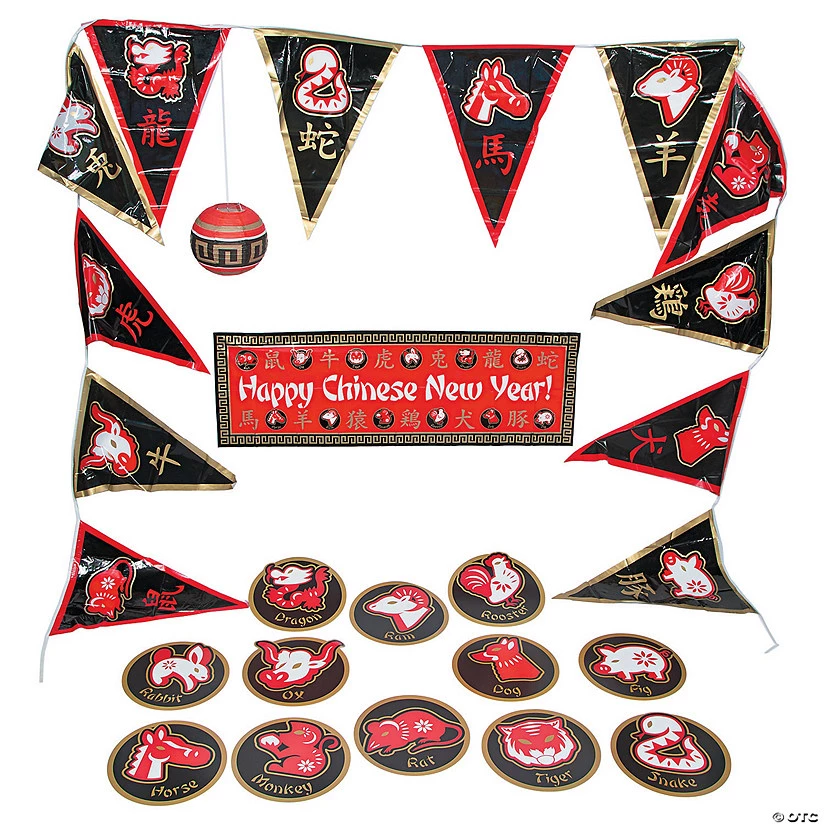 Celebrate February 19th with these Chinese New Year decorations. This Chinese New Year Decorating Kit has everything you need for an authentic Chinese New Year’s party. Includes a 52 1/2″ x 17″ plastic banner, six 10″ paper lanterns, 20″ x 24 ft. pennant banner, and twelve 14″ cutouts. (20 pcs. per set) © OTC