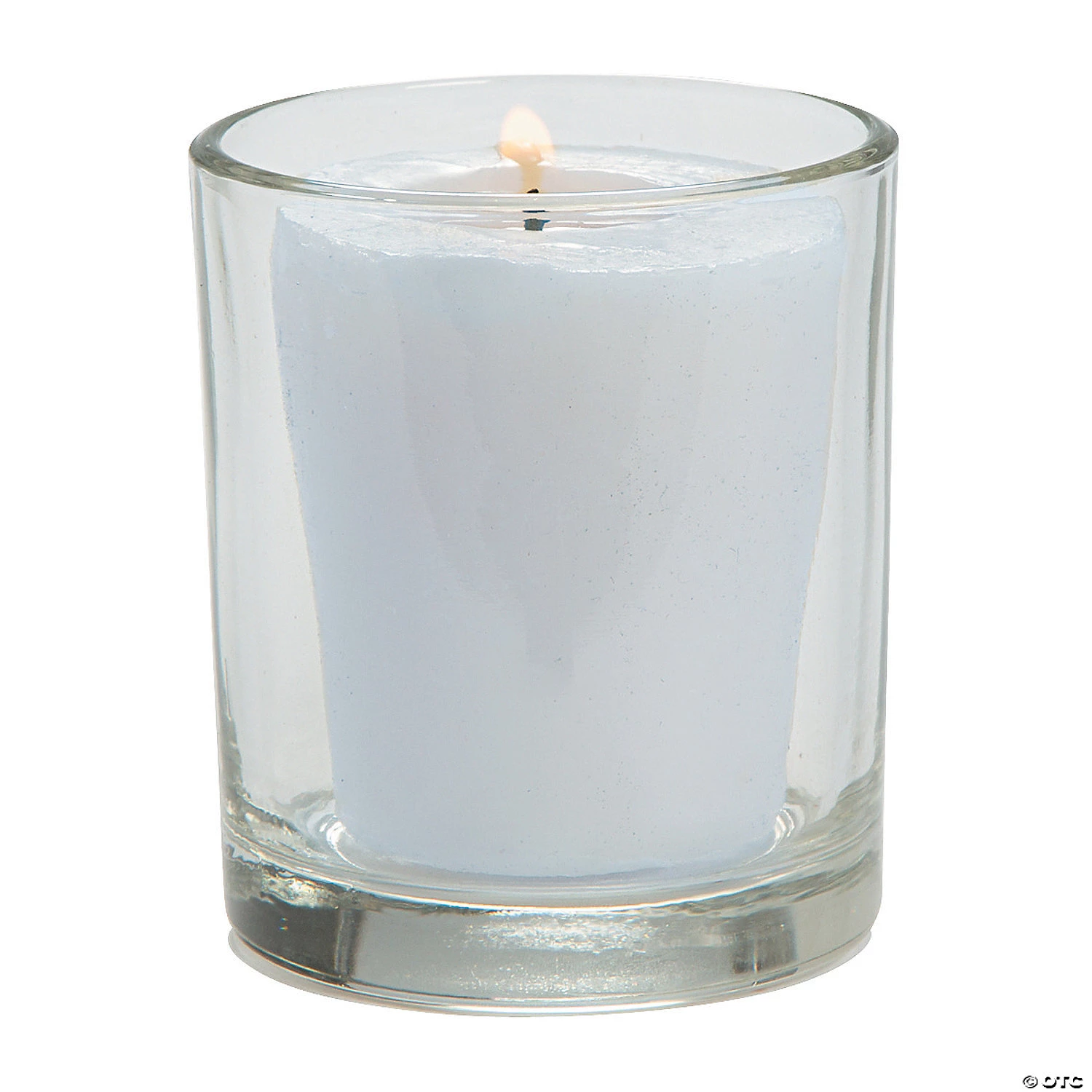 Clear Votive Candle Holders. Use glass votive cups alone or together for accent lighting. Clear Votive Candle Holders are an easy wedding decoration and great centerpiece idea for reception tables. Add Votive Candle Holders to your special event tables along with your own candles in any party colors. 2″ x 2 1/2″ diam. Candles not included.