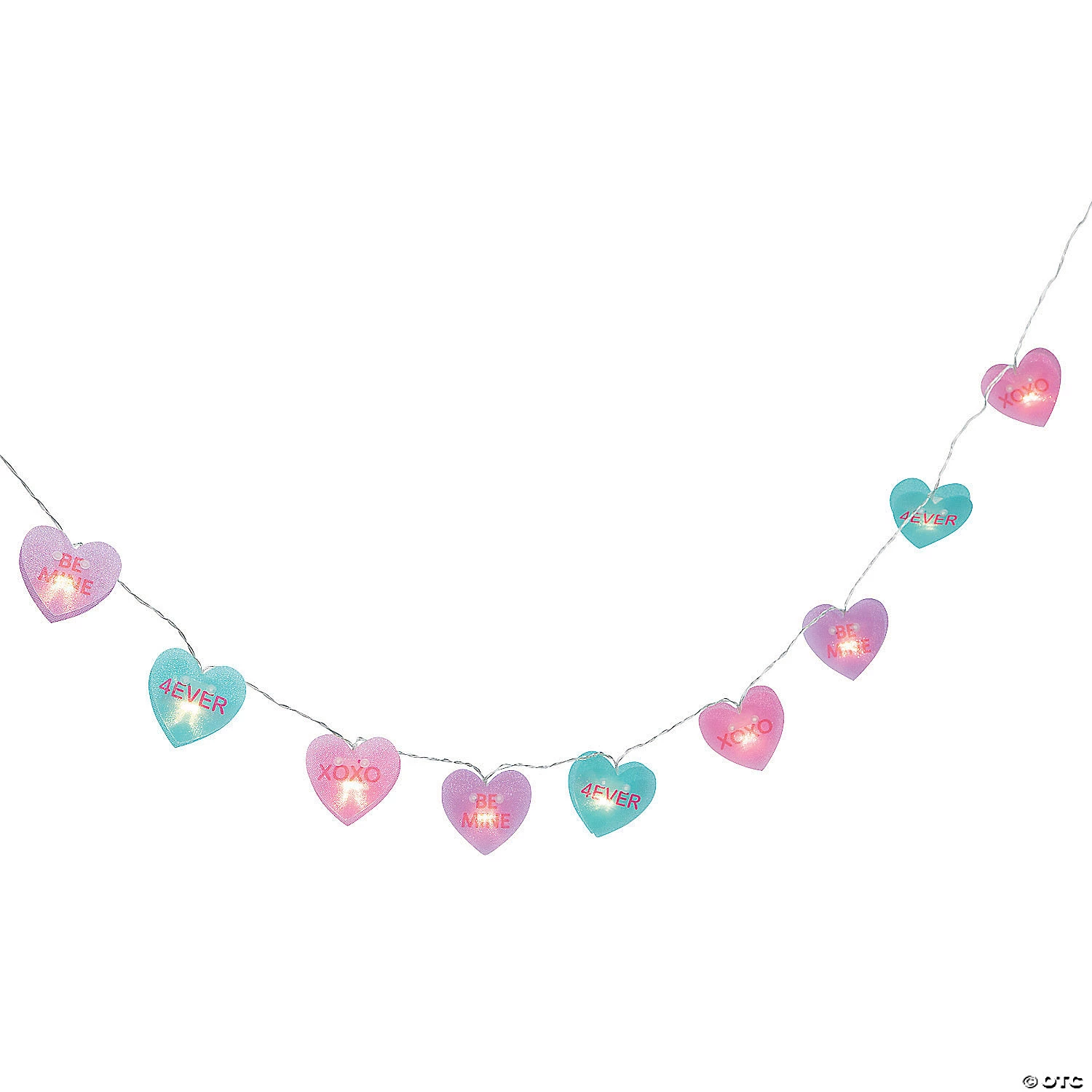 Add a little conversation to your Valentine’s Day decorations with this string light set! Featuring conversation hearts featured on the classic candy, add these lights to tablescapes or hang them on the wall or ceiling for a fun Valentine’s Day party look. Plastic. 64″ with 2 1/2″ hearts. Requires 2 “AA” batteries, not included.