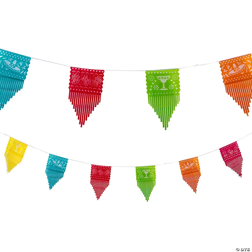 Adding a little color and charm to your fiesta festivities has never been easier! Featuring fringe banners with cutouts of sombreros, cacti and margaritas, this large banner is great for Cinco de Mayo party décor. Use it to line the tops of walls, the space behind the buffet table or in a DIY photo booth backdrop. Guests will come for the tacos but stay for the atmosphere-creating accents like this! Plastic. 100 ft. © OTC