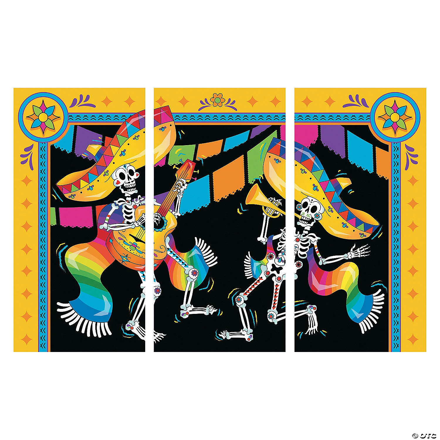 A great addition to Day of the Dead and Halloween party decorations, this vivid banner is a fantastic photo backdrop that’s sure to set the scene for a spooky, skeleton-filled soirée. Featuring an image of two bone buddies playing a tune amid splashes of rainbow color, it brightens up your celebration in an eerie way. Easily hang it on any wall, and watch as partygoers start dancing as if bewitched! Plastic. (3 pcs. per set) Assembled, 9 ft. x 6 ft. Simple assembly required. © OTC