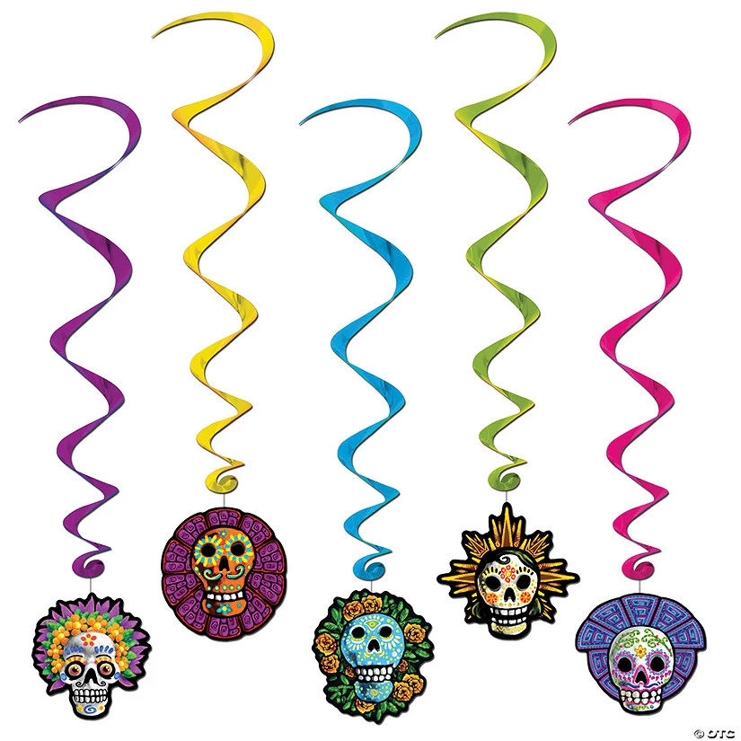 Day Of The Dead Whirls. Celebrate the mexican holiday Dia De Los Muertos! These Day Of The Dead Whirl hanging decorations will brighten up a room! 1 pack includes: 5 whirls made of spiraled mylar with a printed emblem on cardboard stock with skeleton designs Each whirl measures 40″ in length. Durable and easy to hang from the ceiling.Special Shipping Information: This item ships separately from other items in your order. This item cannot ship to a P.O. Box. This item may be subject to additional processing days.ITEM IS NOT ELIGIBLE FOR EXPEDITED SHIPPING