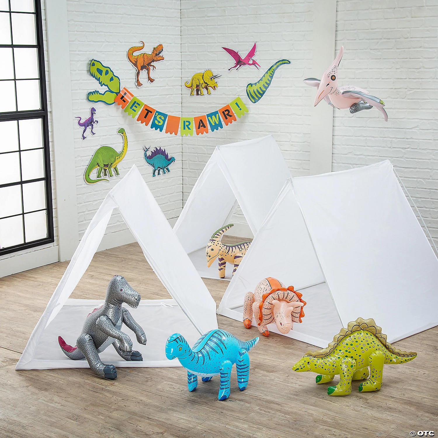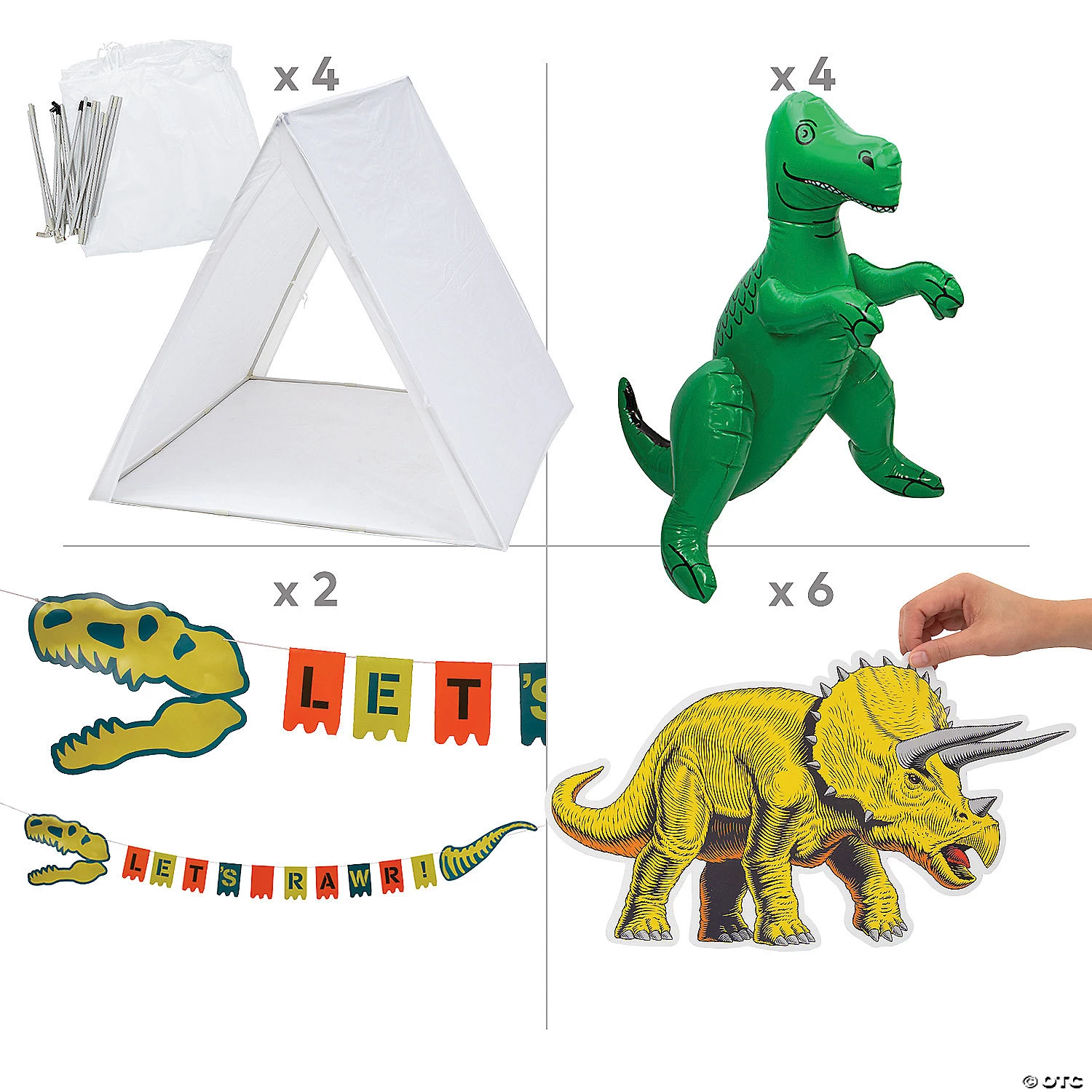 If you’re planning a dinosaur birthday party, this dino slumber party kit will make your party prep a dream. Kids will love camping out in the playroom or party area, surrounded by inflatable dinos and dino cutouts. When the party’s over, the birthday girl or boy can keep their very own dinosaur campgrounds. (18 pcs. per unit)Includes:• 2 Dino Dig Birthday Garlands (Paper. 7 ft. x 14 1/2″)• 6 Dinosaur Wall Cutouts (Cardstock. 10 1/2″ – 25″ x 9 1/2″ – 16″)• 6 Jumbo Inflatable Dinosaurs (Assorted. Vinyl. Inflated, 27″ – 30″. Recommended for ages 3+.)• 4 White Nonwoven Polyester Sleepover Tents (45″ x 43″ x 40″ Simple assembly required.)• Assortments are subject to change at any time and may vary from picture shown. Substituted items will be similar in nature.