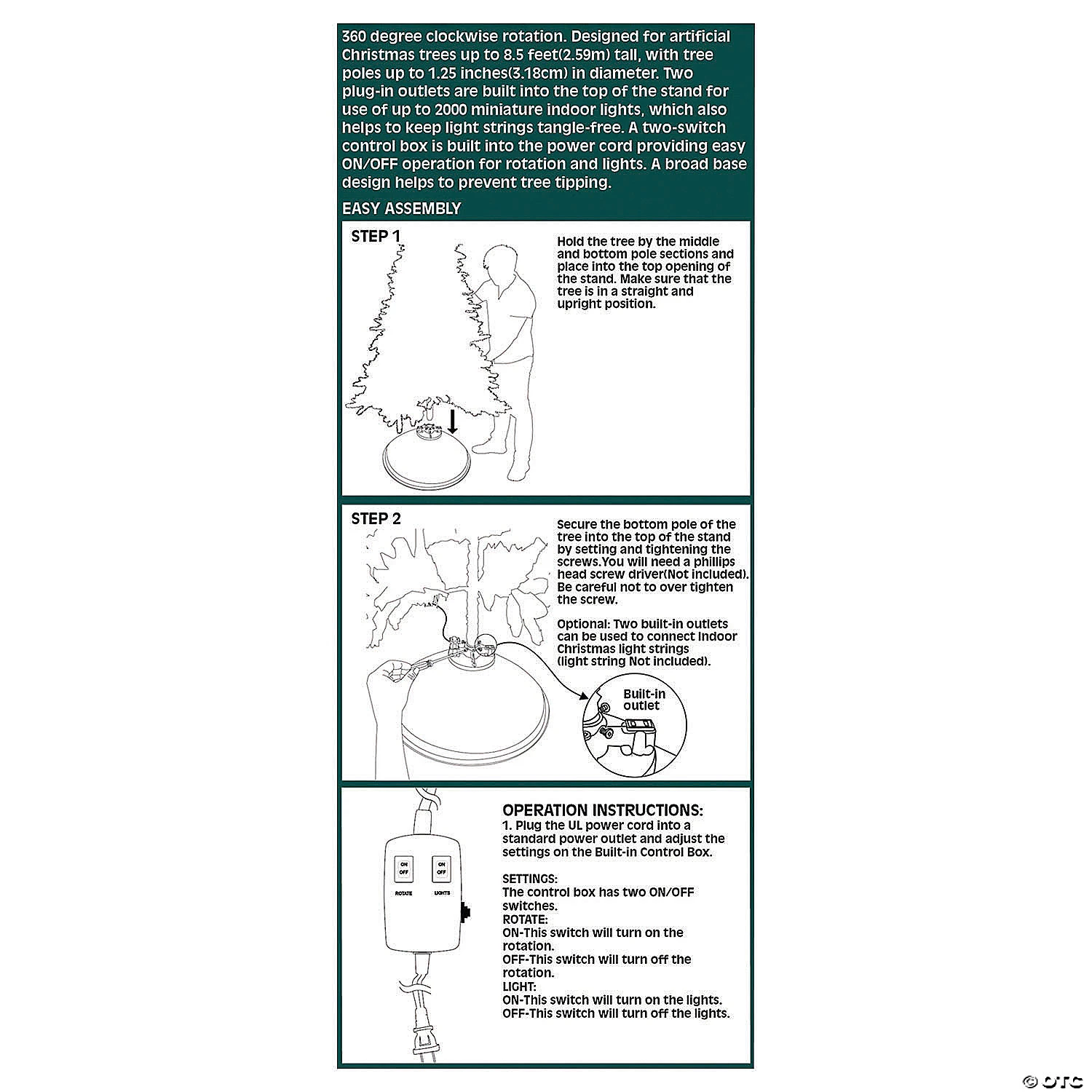 Display all of your favorite Christmas ornaments and glittering light strings with this convenient Christmas tree stand. Designed for artificial Christmas trees, it has plugs for lights built directly into the base to avoid tangling and automatically rotates 360 degrees so you can enjoy each inch of your hard work. Make your living room sparkle when you easily activate the on/off switch. A seperate switch allows you to turn off your Christmas lights. The broad and steady base prevents your tree from tipping. A holiday must-have! Suitable for tree poles up to 102″ tall and 1 1/4″ diam. Input: 110 V AC, 60 Hz. Simple assembly required.Special Shipping Information: This item ships separately from other items in your order. Imported.