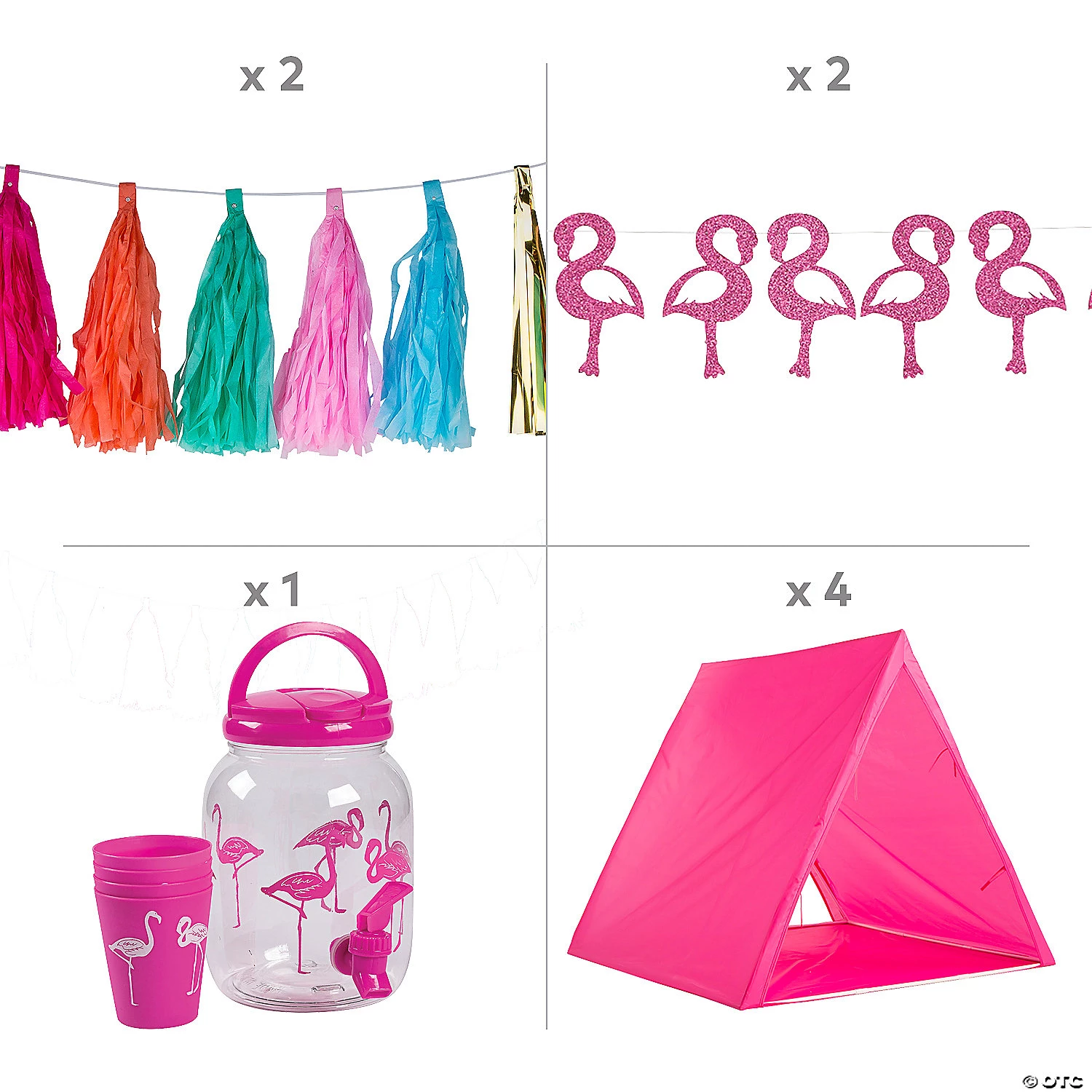 A flamingo-fied night of fun and treasured memories await your party guests with the help of this kit! Featuring decorations, party supplies and tents to sleep in, your birthday girl can invite 3 of her friends to join in on the special occasion. Supplement this kit with a few favorite party treats and games to play and you’re on your way to creating an unforgettable night! (13 pcs. per unit)Includes:• 2 Tissue Paper Bubblegum Tassel Garlands (6 ft. x 6″)• 5-Pc. Plastic Flamingo Drink Dispenser with Cups Kit (Dispenser, 8″ 80 oz.; cups, 3-1/2″ 6 oz.)• 2 Paper Flamingo Glitter Garlands (5″ x 6 ft.)• 4 Nonwoven Polyester Pink Sleepover Tents (45″ x 43″ x 40″ Simple assembly required.)• Assortments are subject to change at any time and may vary from picture shown. Substituted items will be similar in nature.