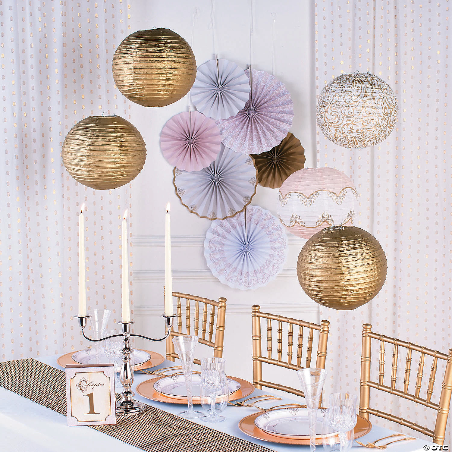 Make your wedding reception even more romantic with these hanging paper lanterns. Love and joy will be in the air along with these gold, white and pink lanterns. A great addition to your wedding decorations, this lantern set will give off the feel of a fairy tale that your guests will love! Includes metal hangers. Paper. (6 pcs. per set) 12″ diam. © OTC Fairy Tale Wedding Paper Lantern Set