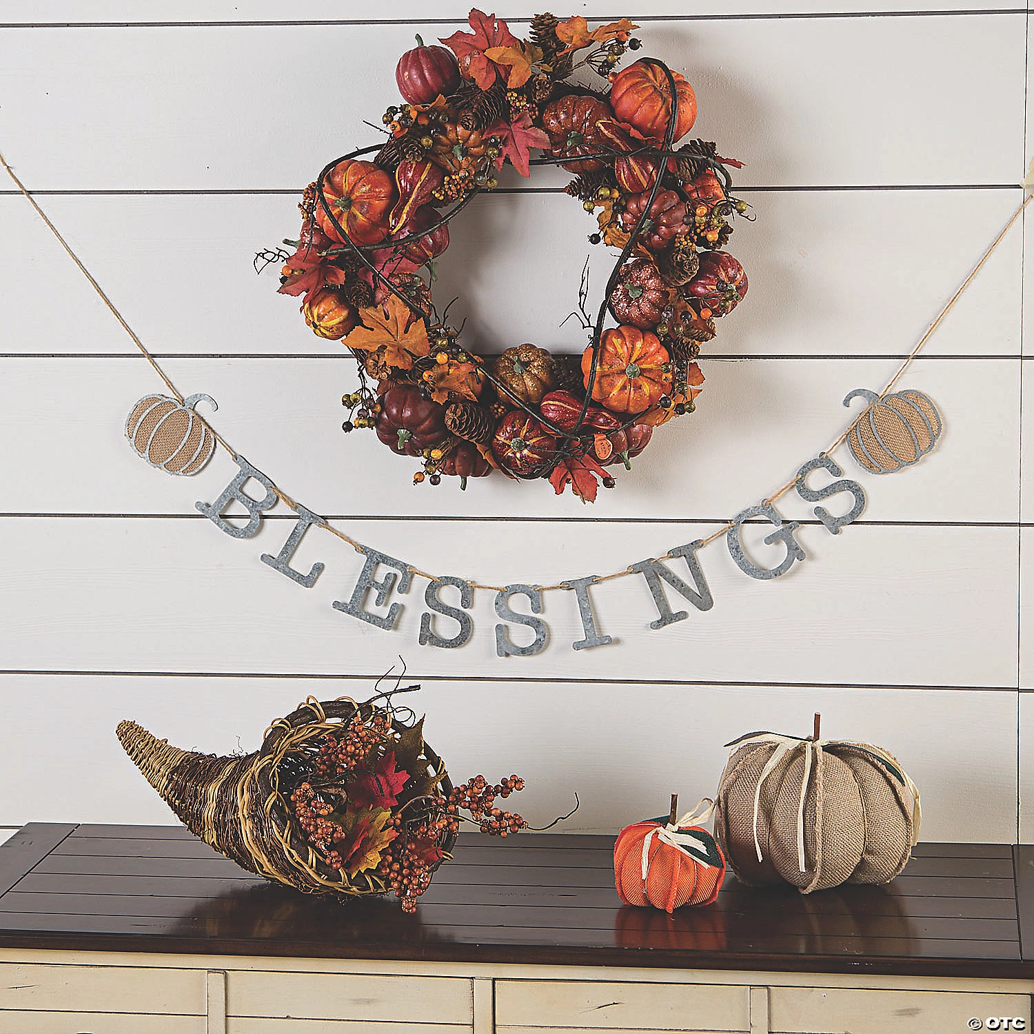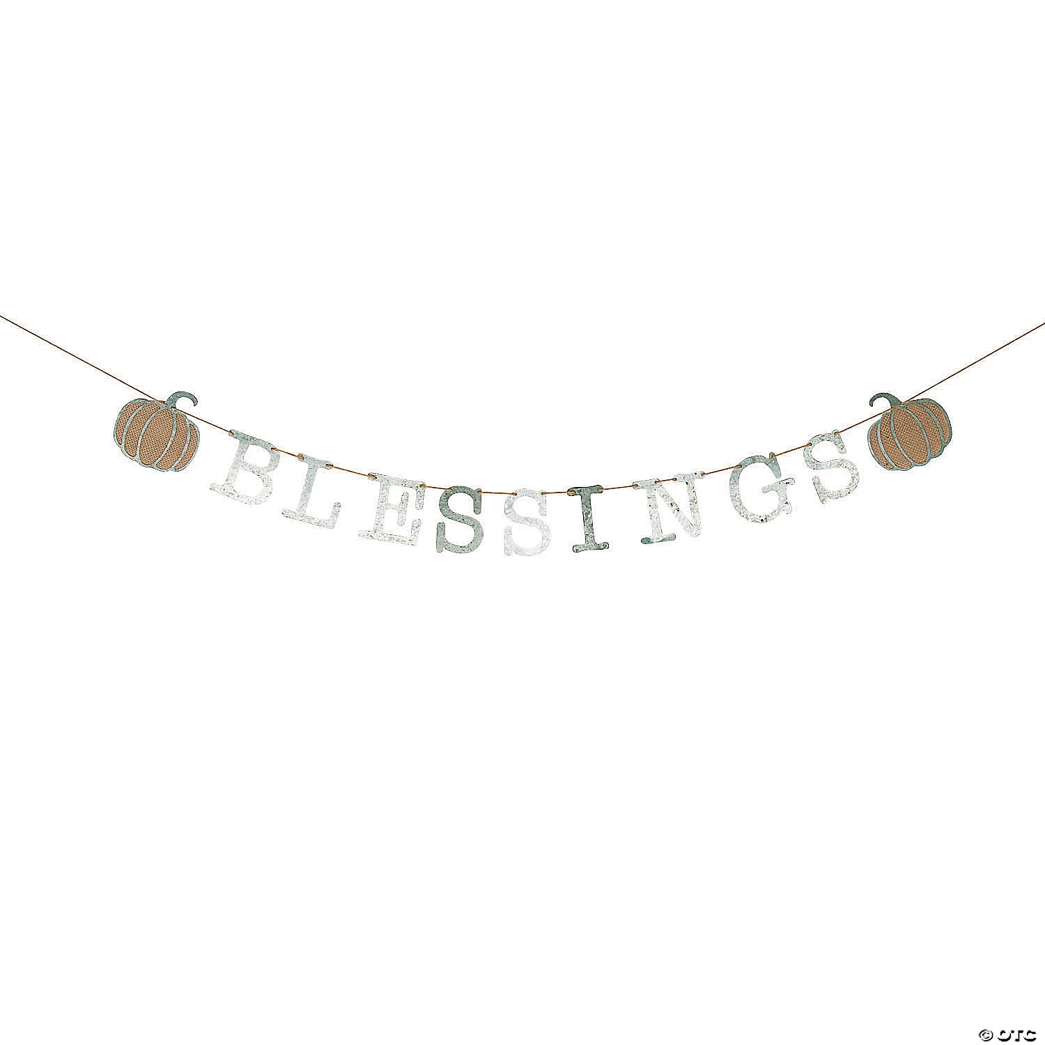 Transform your home into a modern farmhouse! A shabby chic addition to fall décor, this garland spells out “Blessings” in rustic galvanized metal. Framing either side are burlap pumpkins ready to dress up your mantel or a wall from the beginning of September ’til Thanksgiving has passed. The harvest season has never looked so good! Metal. 5 ft. © OTC