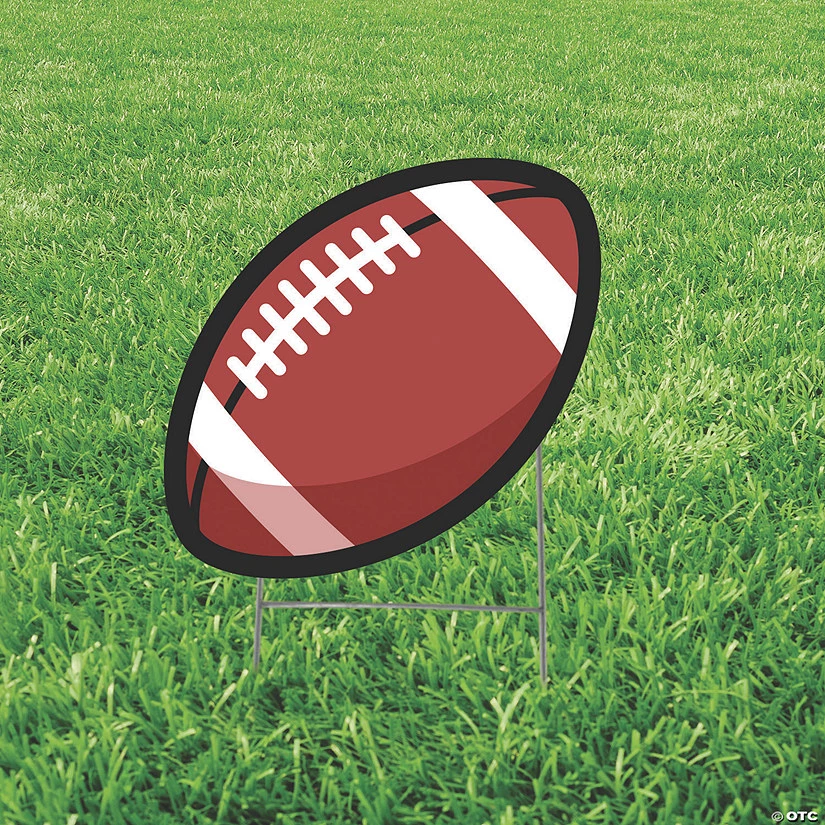 This football yard sign is a touchdown for football lovers! Decorate the yard of your favorite football player or decorate your own yard to show the community how much you love the game. Display the football yard sign by itself or with other yard signs for a fun, colorful look. Share your love of football with your community with this eye-catching football yard sign! Includes metal stakes. Corrugated plastic. 29″ x 18 1/2″ Simple assembly required.