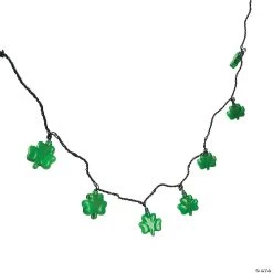 Glowing Shamrock Lights. Add this festive Irish décor to your St. Patrick’s Day party! Create a lucky green glow in a living room, party room, classroom and office with festive four-leaf clovers. Drape these green decorative lights around garland, hang it from doorways, wrap it around banisters or place these lights anywhere you could use an extra lucky glow! Each 8-ft. strand includes ten 2 1/4″ plastic shamrock lights. Light sets interconnect. UL listed for indoor use.