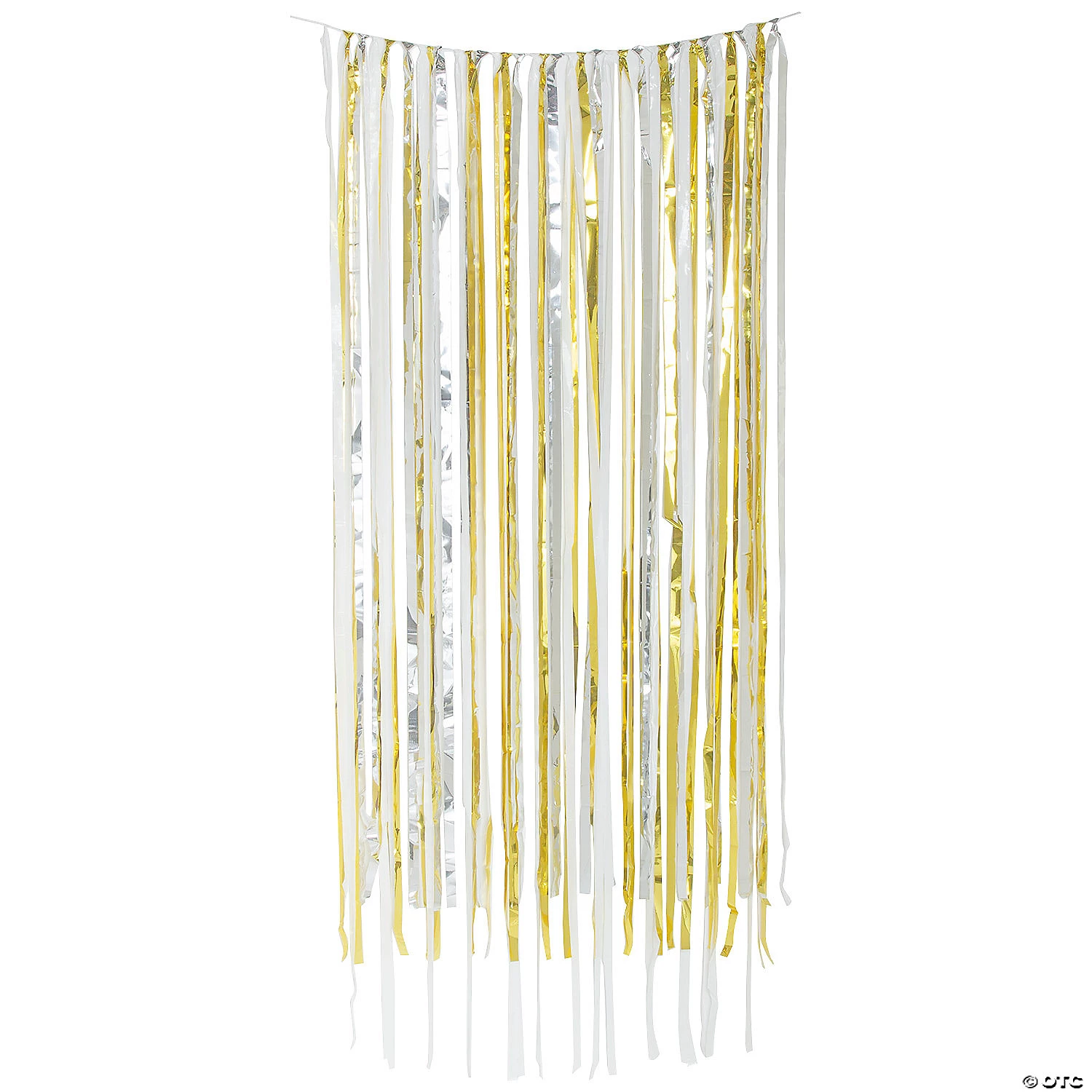 Adding some glitz and glamor to your gathering is easy with this eye-catching streamer backdrop. Featuring gold, silver and white streamers cascading down, this backdrop is perfect for a photo booth or selfie station at a wedding reception, birthday party, bridal shower or any other gathering where photos will be taken. Plastic. 5 ft. x 7 ft. © OTC
