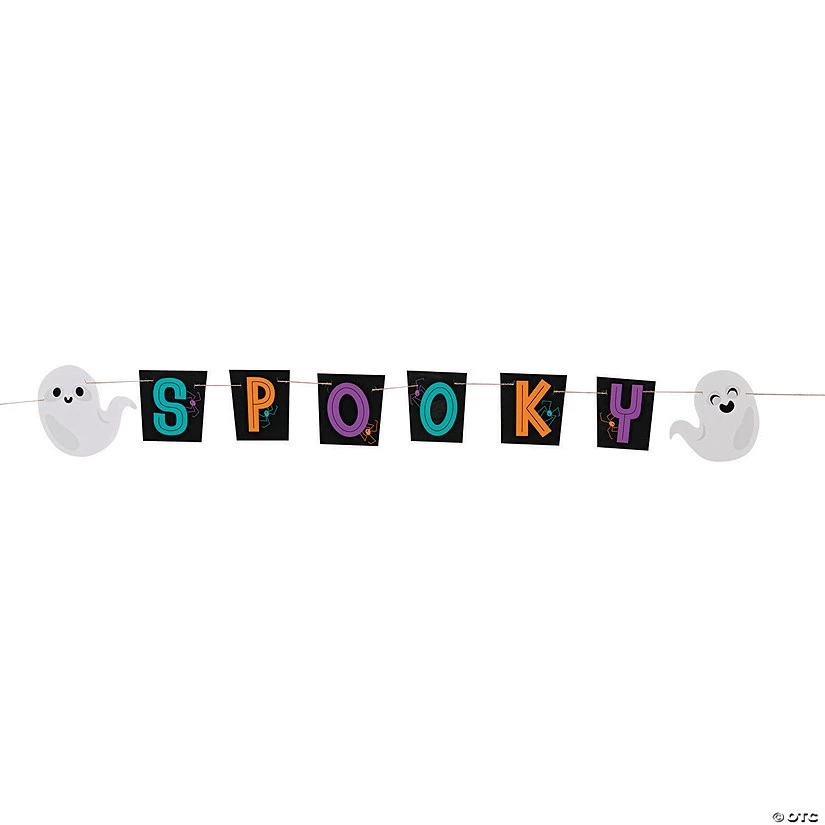 Go spooktacular with your Halloween party decorations and hang up this awesome Goofy Ghouls Garland! It features happy ghosts next to the word “Spooky” in neon colors on a black background with little spiders crawling about the letters. It’s a perfect Halloween decoration to hang inside your front door to greet trick-or-treaters and a fun background for photos of little ones in their Halloween costumes. Cardstock. 6 1/4″ – 8″ x 7″ – 8 1/4″ pennants on a 7-ft. jute garland. © OTC