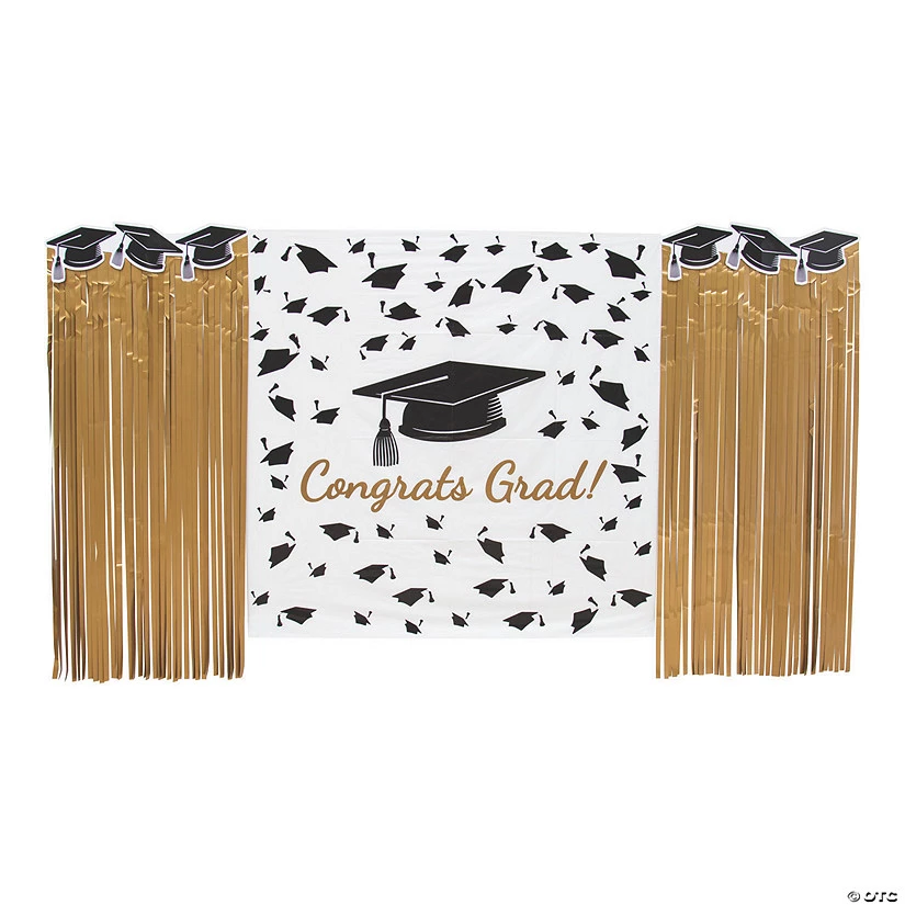 Make sure everyone gets a great photo with the grinning graduate in front of this amazing photo booth set! Add this kit to your graduation party supplies and set it up near the gift table or the spot where the graduate is holding court. Check out more grad party supplies and decorations elsewhere on this site. (5 pcs. per unit) One plastic backdrop, 6 ft. x 6 ft.; two foil door curtains, 36″ x 78″; two cardstock cutouts; 36″ x 11″. Simple assembly required. © OTC