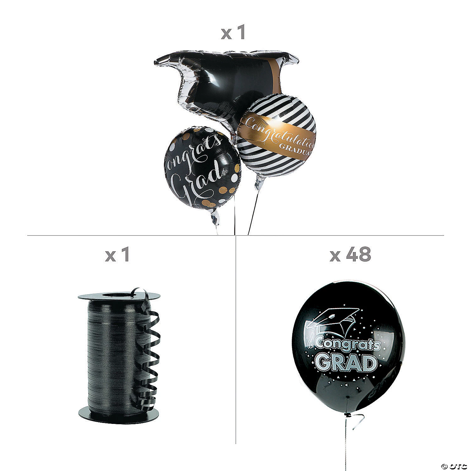 • QUALITY DECORATIONS: If you’re planning a party, this thoughtful balloon bouquet has you covered. It’s made from quality balloons that can easily be mixed and matched with other balloon options for your ideal color scheme or event theme.• EASY TO INFLATE: The balloon in this kit are easy to inflate with air or helium! We recommend using helium if you plan to add them to balloon accessories (such as a weight with ribbon), so they stay afloat!• PARTY SUPERSTORE: We are your one-stop graduation party shop! Come to Oriental Trading for all of your party supply needs, from party decorations to tableware to party favors and more.• PERFECT FOR ANY EVENT: Balloon decorations aren’t just for birthday parties! We have an amazing range of versatile balloon decorations to fulfil your every celebration need.Product Description:Make the graduate feel extra special with a balloon bouquet! A thoughtful graduation party supply that’s a great way to welcome your special student to the commencement of their career, it’s a fun alternative to a traditional flower bouquet. Place it on the buffet, or use it to bring guests’ attention to the gift table! It makes a fantastic balloon centerpiece. Featuring over 50 balloons, it’s eye-catching and thoughtful. Quantity: 52 pcs. per kitMaterial: Latex, MylarIncludes:• 48 Black Congrats Grad Latex Balloons (11″)• 3 Black & Gold Graduation Mylar Balloons (18″ – 30″ x 20″)• 1 Polypropylene Black Curling Ribbon (3/16″ x 500 yds.)Assortment may vary. Simple assembly required.© OTC