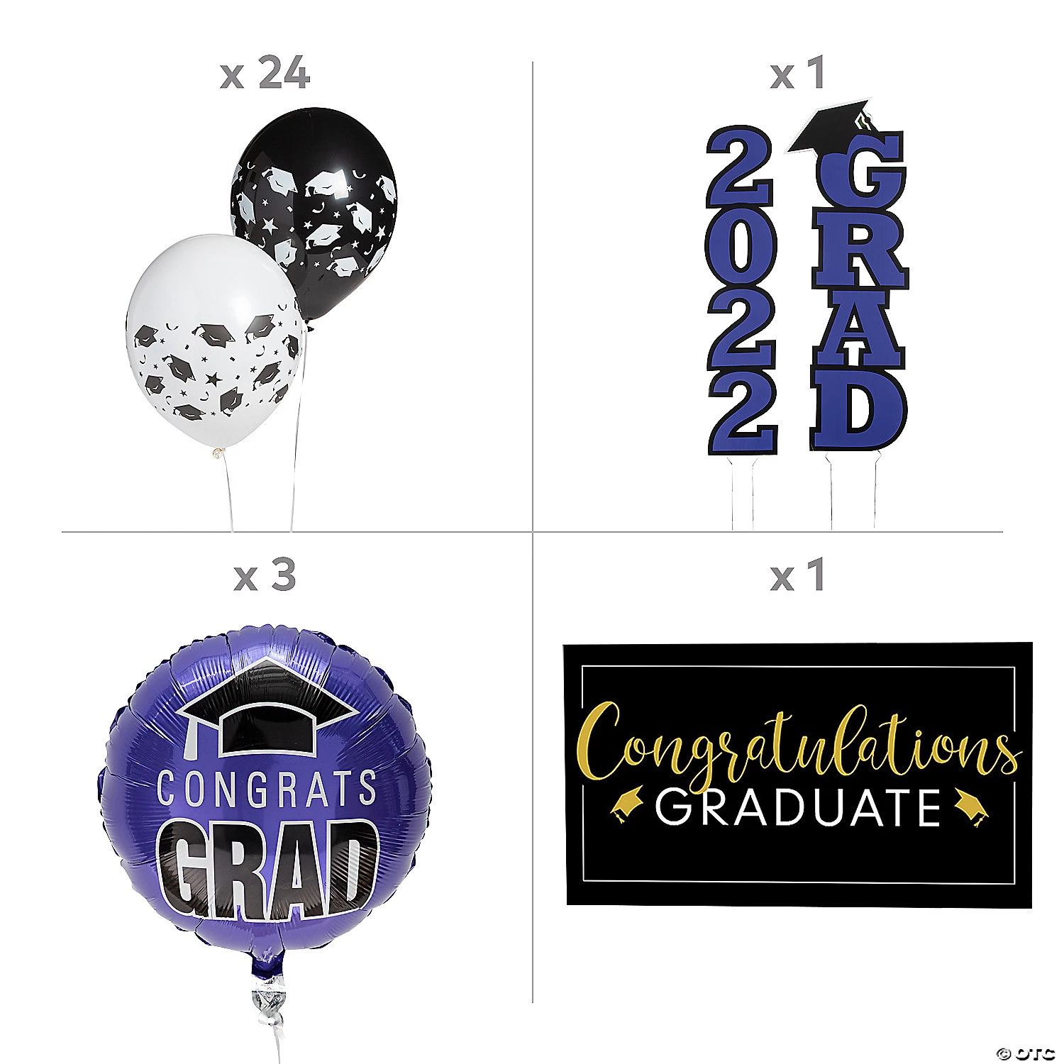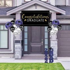 Make a big deal out of your graduate’s accomplishments with this eye-catching outdoor decorating kit that’s full of graduation congratulations. Grads will feel extra special and celebrated with this kit displayed outside their home. Great for outdoor graduation party decorations or just to let the community know about a special graduate, this kit makes it easier than ever to celebrate a grad! (30 pcs. per unit) Assortment may vary.• Includes:• 1 Plastic Giant Congratulations Graduate Banner (72″ x 42″)• 24 Black & White Graduation Latex Balloons (11″)• 2 Corrugated Plastic 2022 Purple Grad Yard Signs (6 1/4″ – 11″ x 28″ – 30″ on 12″ metal stakes. Simple assembly required.)• 3 Congrats Grad Purple Mylar Balloons (18″)