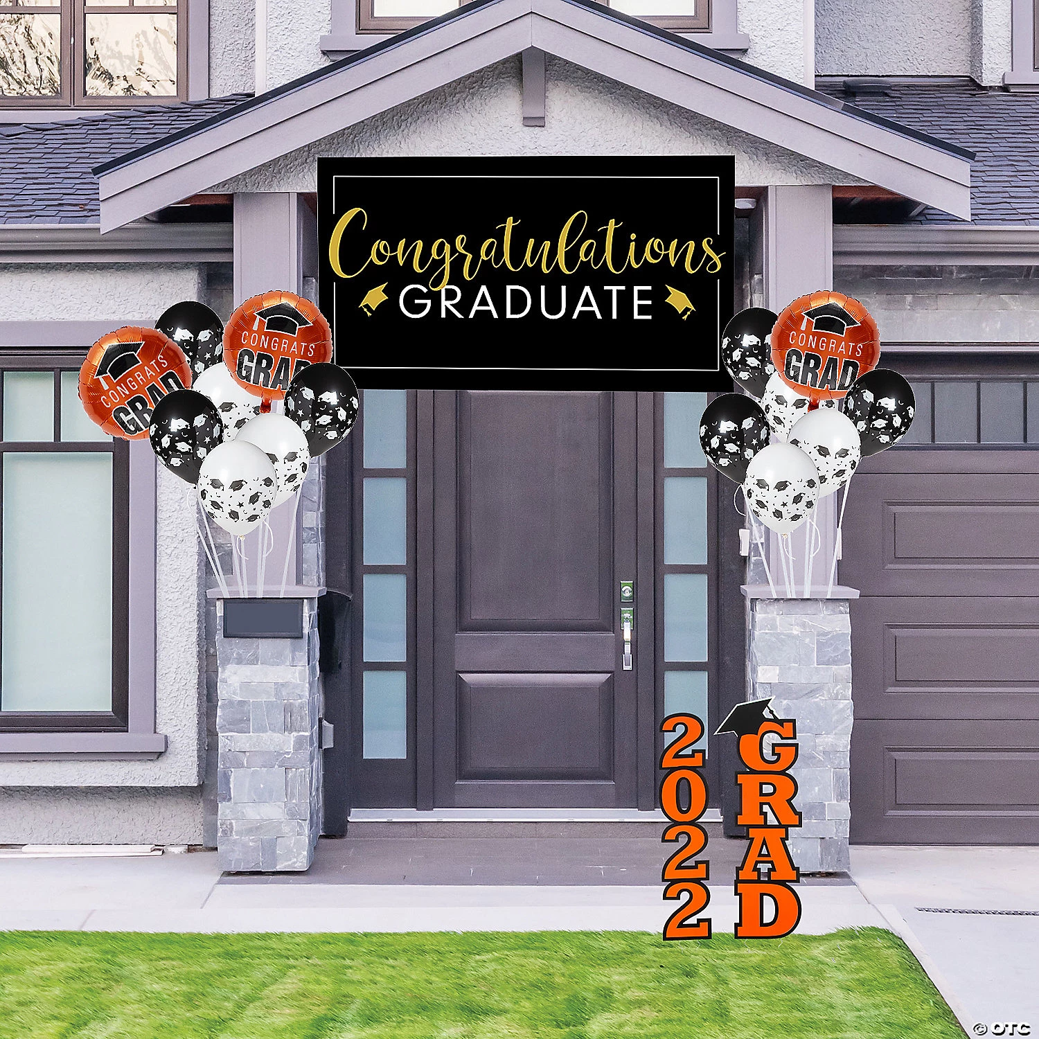 Make a big deal out of your graduate’s accomplishments with this eye-catching outdoor decorating kit that’s full of graduation congratulations. Grads will feel extra special and celebrated with this kit displayed outside their home. Great for outdoor graduation party decorations or just to let the community know about a special graduate, this kit makes it easier than ever to celebrate a grad! (30 pcs. per unit) Assortment may vary.• Includes:• 1 Plastic Giant Congratulations Graduate Banner (72″ x 42″)• 24 Black & White Graduation Latex Balloons (11″)• 2 Corrugated Plastic Orange 2022 Grad Yard Signs (6 1/4″ – 11″ x 28″ – 30″ on 12″ metal stakes. Simple assembly required.)• 3 Congrats Grad Orange Mylar Balloons (18″)