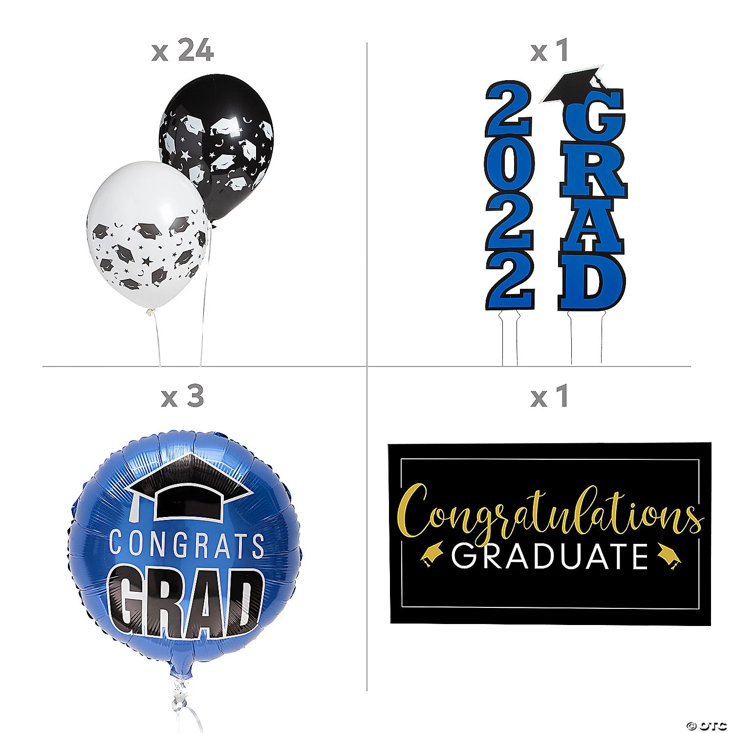 Make a big deal out of your graduate’s accomplishments with this eye-catching outdoor decorating kit that’s full of graduation congratulations. Grads will feel extra special and celebrated with this kit displayed outside their home. Great for outdoor graduation party decorations or just to let the community know about a special graduate, this kit makes it easier than ever to celebrate a grad! (30 pcs. per unit) Assortment may vary.• Includes:• 1 Plastic Giant Congratulations Graduate Banner (72″ x 42″)• 24 Black & White Graduation Latex Balloons (11″)• 2 Corrugated Plastic 2022 Blue Grad Yard Signs (6 1/4″ – 11″ x 28″ – 30″ on 12″ metal stakes. Simple assembly required.)• 3 Congrats Grad Blue Mylar Balloons (18″)