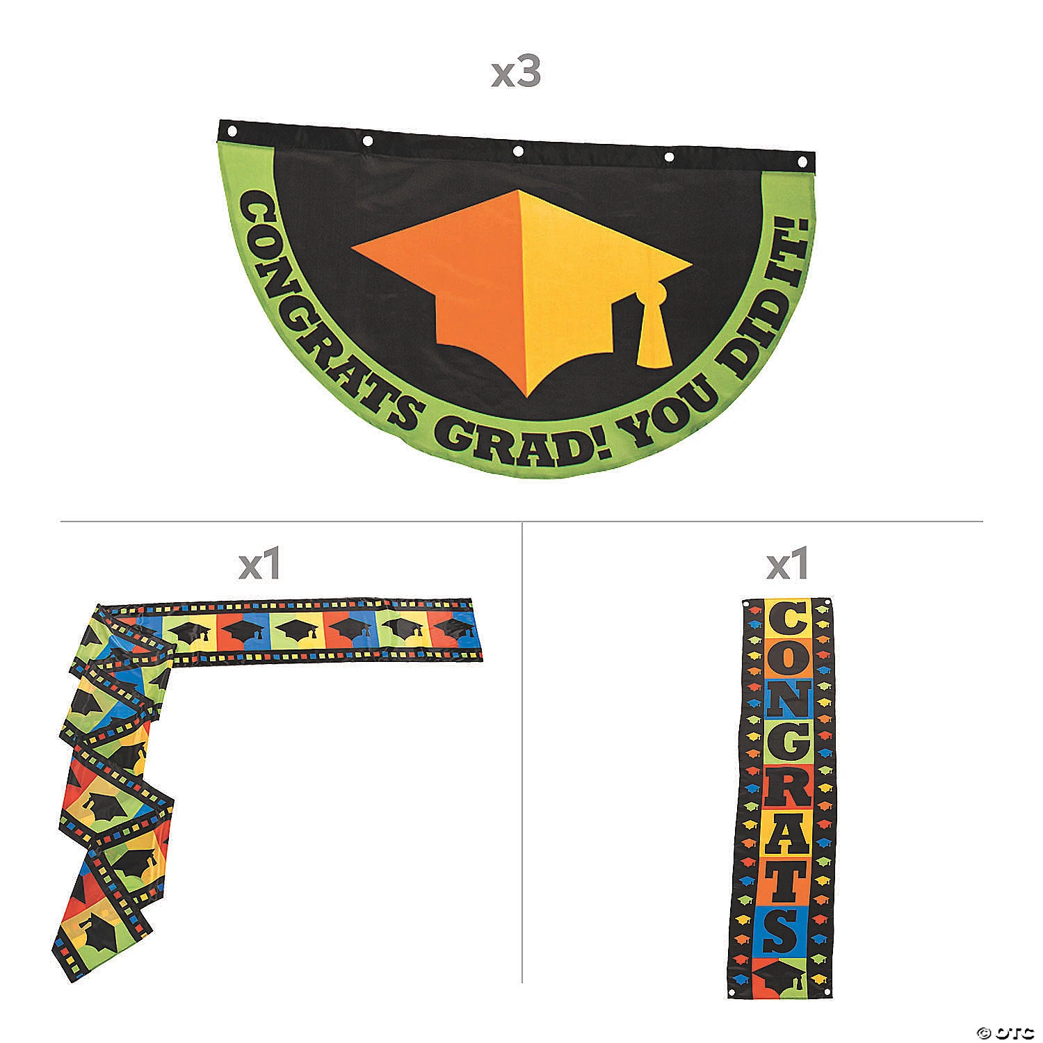 This set of graduation party supplies makes outdoor décor easy! Featuring bunting and banners, it’s a quick, easy way to make your event stylish. That special celebration will be fun, fashionable and, best of all, you’ll be done with preparation in no time! Includes one 15″ x 5 ft. 9-1/2″ banner, one 20 ft. x 18″ banner and three 3 ft. 3″ x 22″ buntings. Polyester. (5 pcs. per unit) © OTC