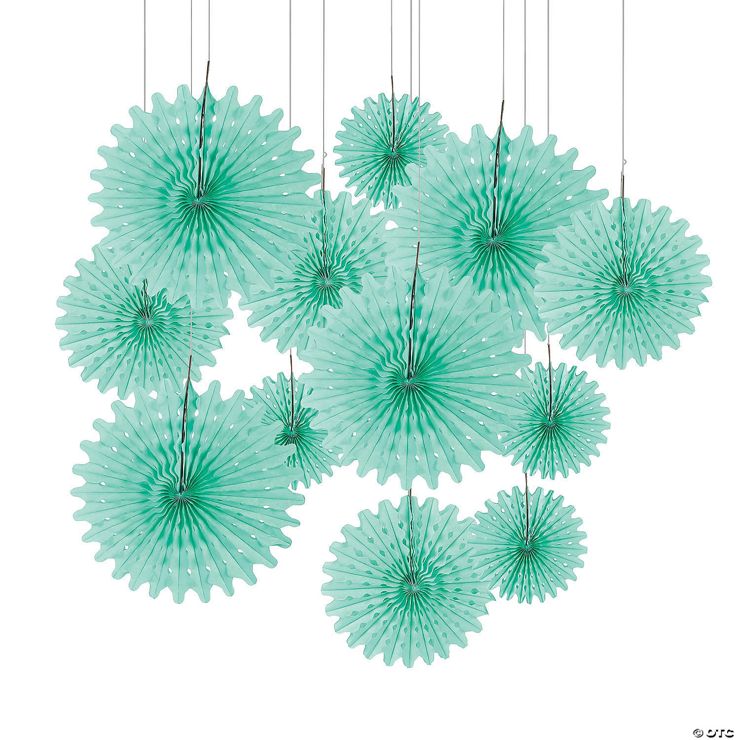• PERFECT FOR ANY EVENT: From birthday parties to school dances to vibrant wedding receptions, these mint green hanging fans make the perfect party decorations. These fans are a versatile and fun choice!• BUDGET-FRIENDLY DECORATIONS: You won’t find these elegant green hanging fans at this low price anywhere else! Why spend more on party decorations when you don’t have to?• QUALITY DECORATIONS: Made from quality materials, these hanging fans only require minimal assembly before they’re ready for your event.• CREATIVE USES: Hanging fans are great as party decorations, and also work for art projects inside and outside the classroom, or as interesting additions to home décor projects. Product Description:Simple and elegant ceiling decorations make it easy to transform any space into a beautiful party place. These tissue paper fans are versatile hanging décor: they’re ideal birthday party decorations, wedding decorations, and prom decorations! Choose your favorite colors and mix and match these tissue fans together for the ultimate DIY photo backdrop. Stock up and be prepared for every celebration occasion.Size: Includes 4 each 8″, 12″ and 16″ diam. Quantity: 12Shape: Round.Material: Paper.Simple assembly required.© OTC
