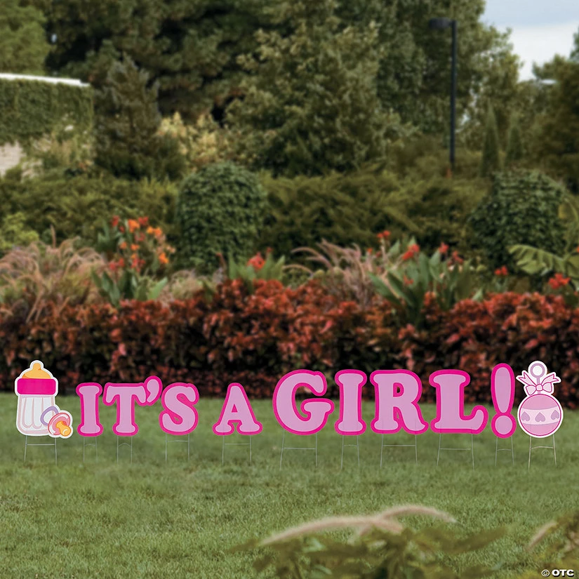 Let the world know that your bundle of joy is a girl with this large yard sign! A great addition to girl baby shower decorations, these signs spell out “It’s A Girl!” in pink letters with a pink rattle and bottle. Celebrate your impending little pink miracle with more baby shower supplies and decorations, found elsewhere on this website. Corrugated plastic. (11 pcs. per set) 7″ – 21″ x 19″ – 25 3/4″ with metal stakes. Simple assembly required.