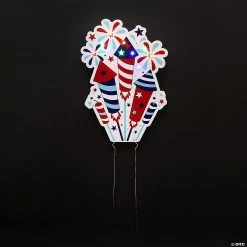 Dazzle the neighborhood with this light-up firework yard sign that’s perfect as an outdoor Fourth of July decoration. Display this light-up sign for patriotic holidays or for any time of year that you want to show off some red, white and blue USA pride. This impressive sign looks like patriotic fireworks and features bulb lights. (2 pcs. per unit) Assortment may vary. Simple assembly required.
