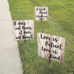These rustic-inspired yard signs feature the verse from 1 Corinthians 13:4. Add them to wedding decorations to lead the way to the ceremony or reception, or add them to the yard for an engagement party or rehearsal dinner. Printed on one side only. Plastic-coated cardstock. (3 pcs. per set) 17″ x 17″ with 18″ metal stakes. © OTC