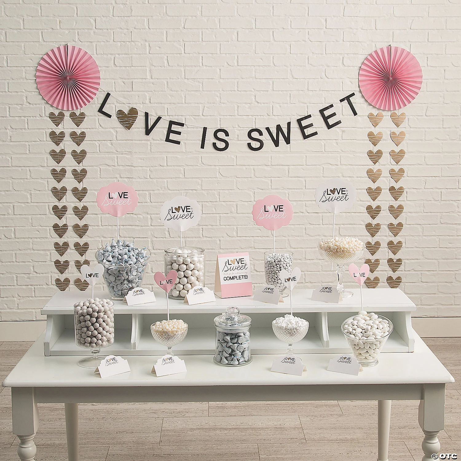 Spruce up your snack bar with this adorable Love is Sweet Treat Table Decorating Kit! Featuring a pink, white and gold color scheme, it works great for a bridal shower, bachelorette party or wedding reception. Cardstock. (24 pcs. per unit) Banner, 7 ft.; four hanging garlands, 5 ft.; 2 paper fans, 16″; 1 love is sweet tent card, 4 1/2″ x 6″; 8 place cards, 4″ x 2 1/2″; four love picks, 3″ icons on 7 1/2″ picks; four love is sweet picks, 6″ icons on 9″ picks. Simple assembly required. © OTC
