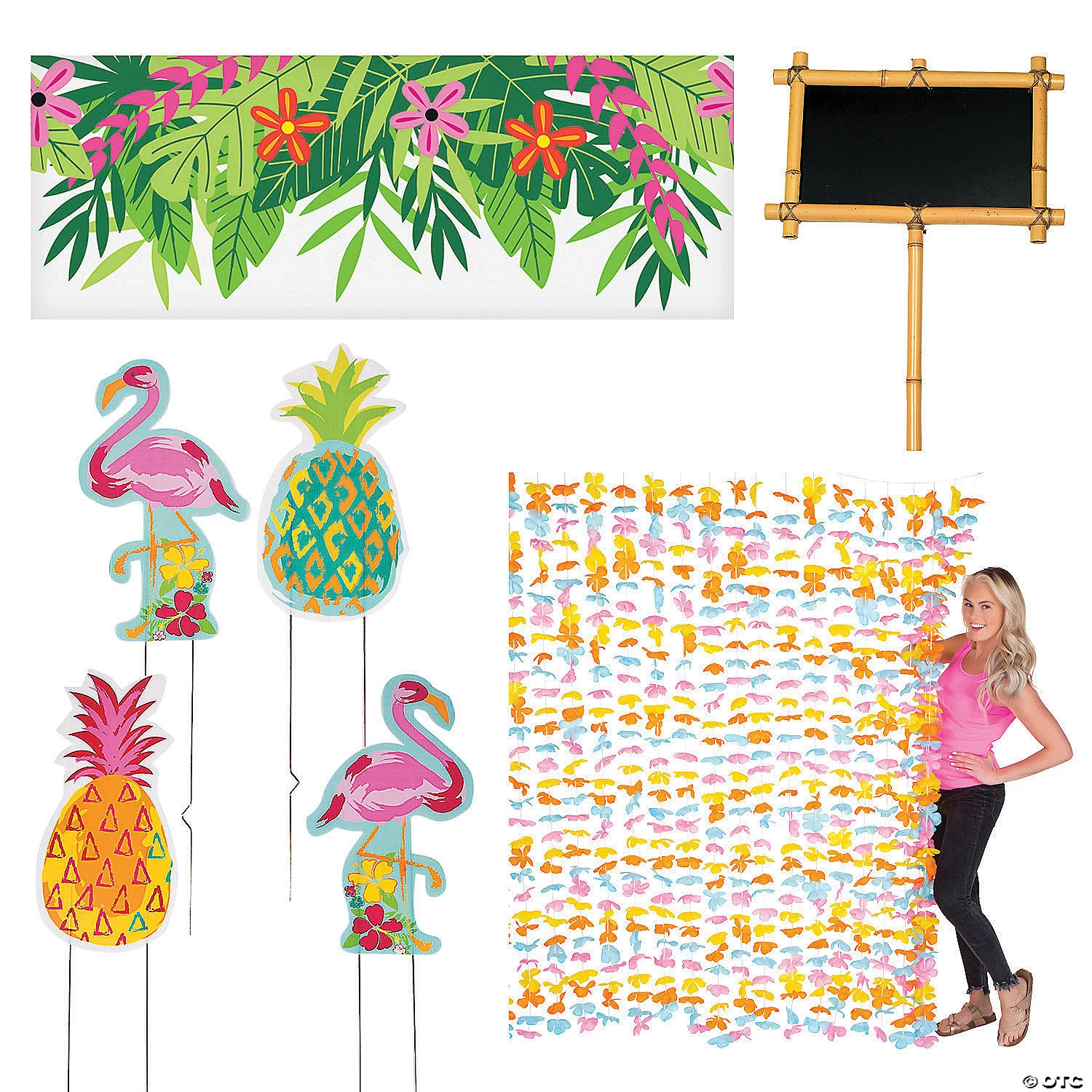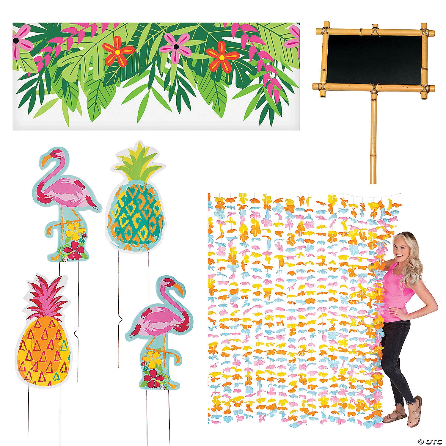 Set the scene for an awesome pool party, backyard BBQ or luau bash with this colorful outdoor décor! Featuring designs like bamboo sticks, flamingos, brightly colored flowers and more, these outdoor decorations can turn any space into a tropical paradise. These luau decorations also make a great backdrop for a photo booth to help guests capture the memories! (7 pcs. per unit) Assortment may vary.Includes:• 1 Chalkboard Bamboo Party Sign (20″ x 13″ sign on a 15″ stake.)• 1 Plastic Luau Leaf Border Roll (40 ft. x 18″)• 1 Polyester Bright Fabric Flower Backdrop (6 ft. x 6 ft.)• 4 Corrugated Plastic Pineapple & Flamingo Yard Stakes (8 1/2″ – 9 1/2″ x 16 1/2″ with 22″ metal stakes. Simple assembly required.)