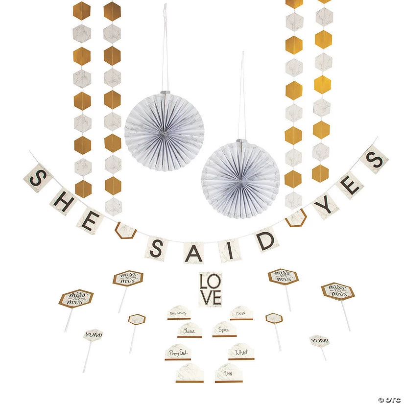 Set up a treat table at your bridal shower or bachelorette party with this fun decorating kit! With a chic marble print, your shower will be styling in no time. Cardstock. (24 pcs. per unit) Pennant banner, 7 ft. with 4 1/4″ x 5″ pennants; eight tent cards, 4″ x 2 1/2″; one love tent card, 4 1/2″ x 6″; four picks, 3″ icons on 7 1/2″ plastic picks; four double-sided Miss. to Mrs. picks, 6″ icons on 9″ plastic picks; two 16″ paper lanterns; two 60″ hanging garlands. Simple assembly required. © OTC