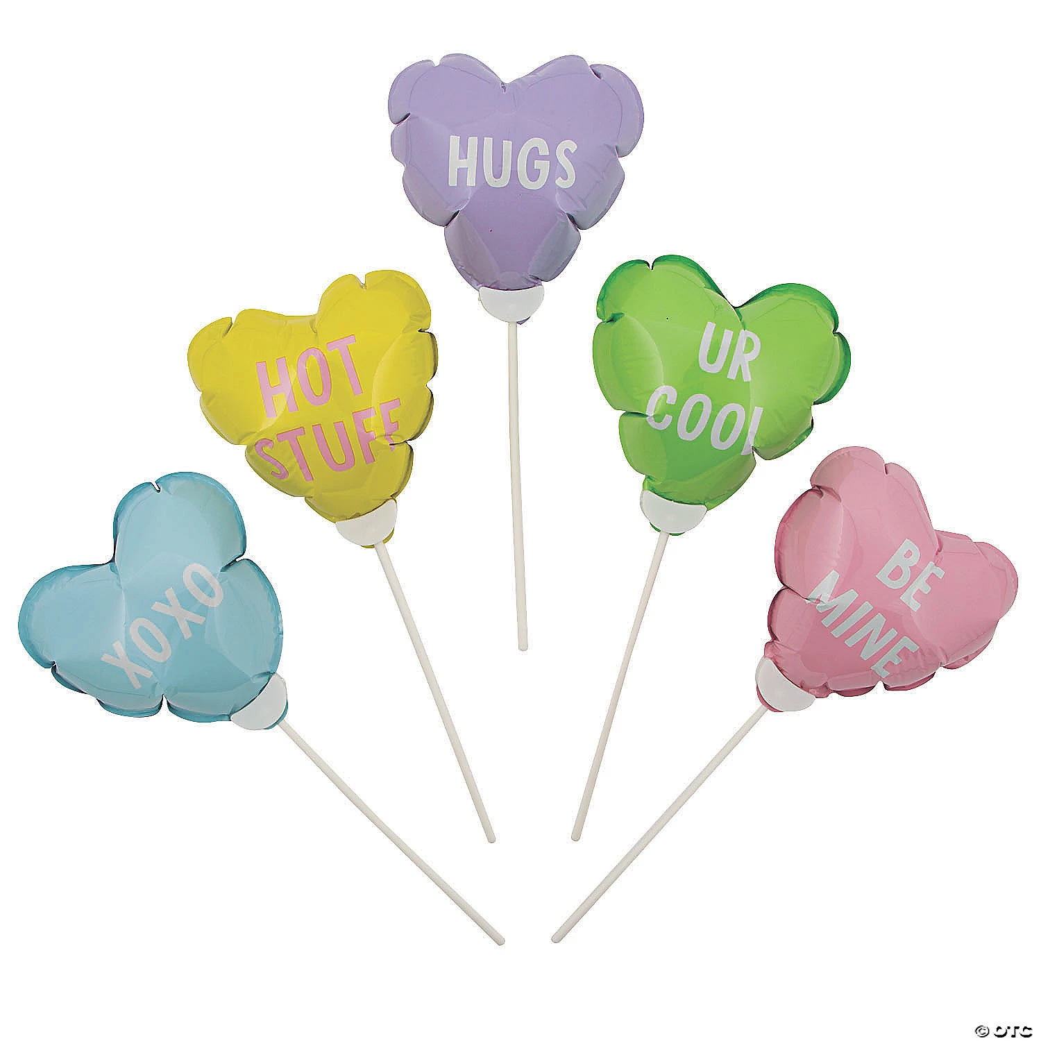 Create a cute balloon bouquet as a gift or hand each Valentine’s Day balloon out to a different valentine with these Conversation Heart Mini Mylar Balloons! Featuring assorted phrases like: hot stuff, ur cool and hugs; they make a large impact for a small balloon! Mylar. Includes ten 5″ balloons and ten 7 1/2″ plastic holders.