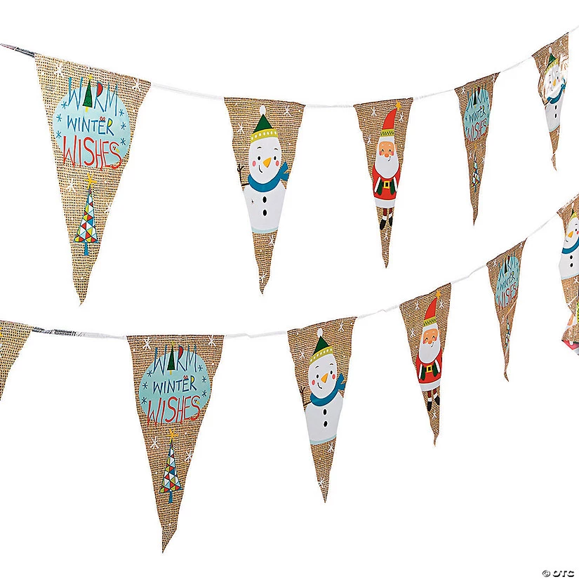 Hang some warm winter wishes! A festive and frosty addition to party decorations, this Nordic banner features fun images of snowmen, Santa Claus and Christmas trees. It’s the perfect size to hang above buffet tables or a mantel place. With this banner, you get the look of burlap for much less, too! The high-quality printed imagery looks oh-so-real and is sure to turn your party space into a rustic winter wonderland! Plastic. Includes 56 pennants. 100-ft. banner with 12 x 18″ pennants. © OTC