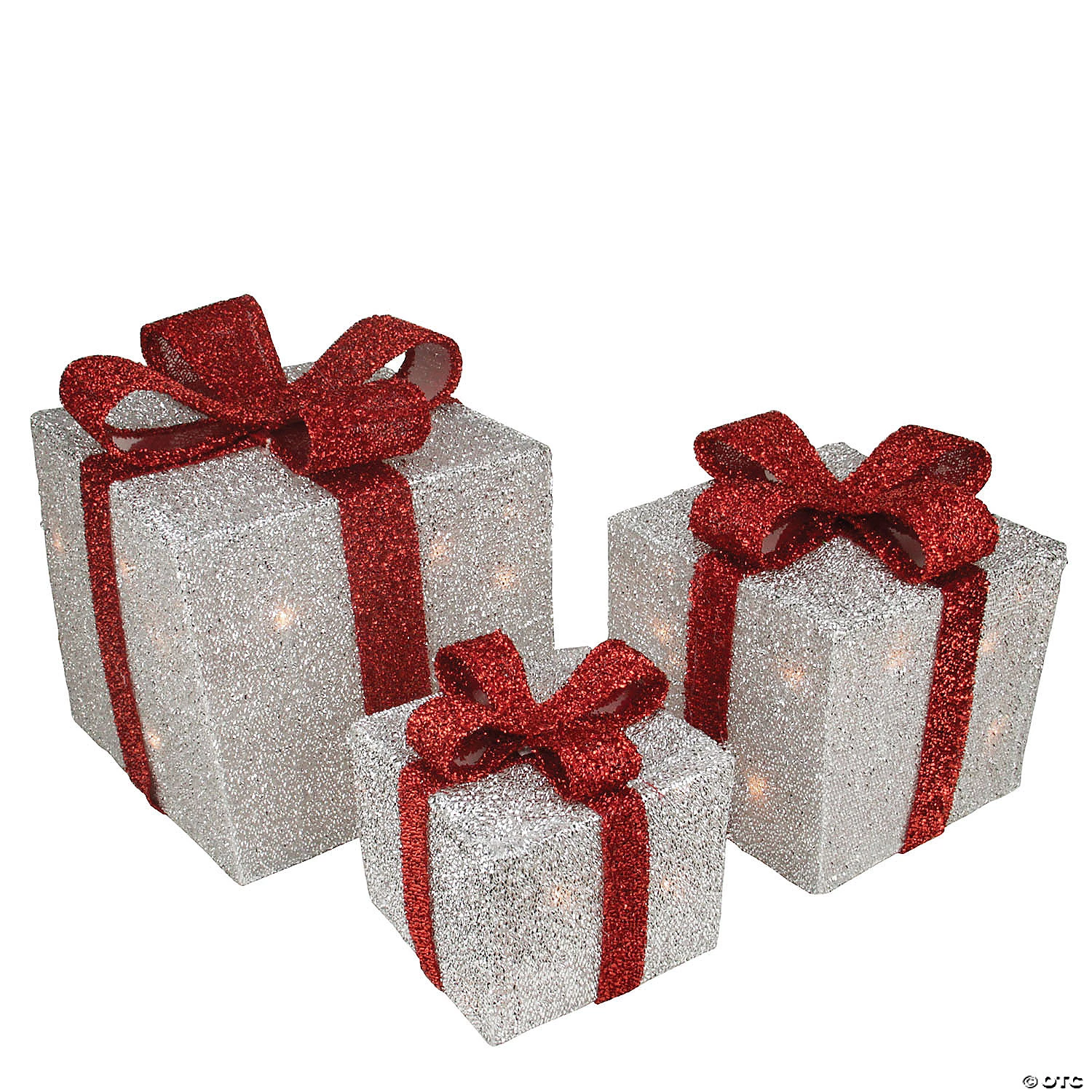 Nothing says Christmas like gift boxes wrapped in bows. Adding illumination to your yard will provide a festive touch. Place on porches lawn or have them inside to create the perfect seasonal setting. Product Features: Silver gift boxes with red bows Pre-lit with a total of 35 clear lights Bulb size: mini 71″ white lead cord Includes: (1) 5.25″H x 6″W x 6″L 8-light gift box (1) 7″H x 8″W x 8″L 12-light gift box (1) 9″H x 10″W x 10″L 15-light gift box Additional Product Features: If one bulb burns out the rest will stay lit Boxes are connected and cannot be used separately Contains 1 plug with end connector which allows you to stack multiple lighted items together (not to exceed 210 watts) UL listed for indoor or outdoor use Ground stakes not included Wire gauge: 22 120 volts 60 hertz 0.12 amps 14.4 watts Material(s): tinsel/metal/glass bulbs/wire Special Shipping Information: This item ships separately from other items in your order. This item cannot ship to a P.O. Box. This item may be subject to additional processing days. ITEM IS NOT ELIGIBLE FOR EXPEDITED SHIPPING