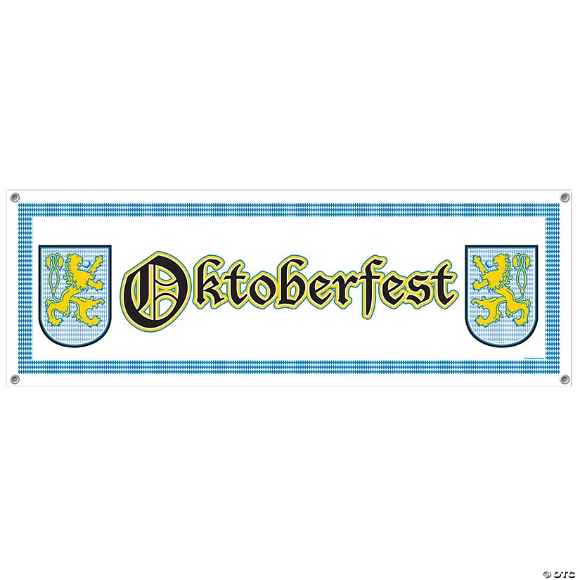 Oktoberfest Sign Banner. Get ready to lift up your lederhosen to party down for an Oktoberfest style party! Banner is white with blue/white border around 2 insignias and the word Oktoberfest between them in the middle. Polyethylene. 5ft x 21in. Good for both indoor and outdoor. Comes with 4 grommets for hanging.Special Shipping Information: This item ships separately from other items in your order. This item cannot ship to a P.O. Box. This item may be subject to additional processing days.ITEM IS NOT ELIGIBLE FOR EXPEDITED SHIPPING
